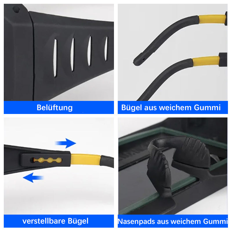 Einfach zu verwenden: Die Brillenbügel bestehen aus importiertem Weichgummi, der ergonomisch geformt und für langfristiges Tragen geeignet ist. Die Bügel sind in der Länge verstellbar und rutschen nicht leicht ab, was für die meisten Arbeiter praktisch ist.
