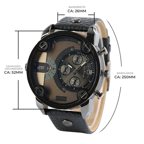 UHRWERK & MATERIAL: Quarzwerk, genaue Zeitmessung. 3 Hilfszifferblätter, Analoganzeige, Zifferblattfenster, transparentes Zifferblatt, Aluminiumgehäuse, verstellbares Lederarmband und klassische Faltschließe.
