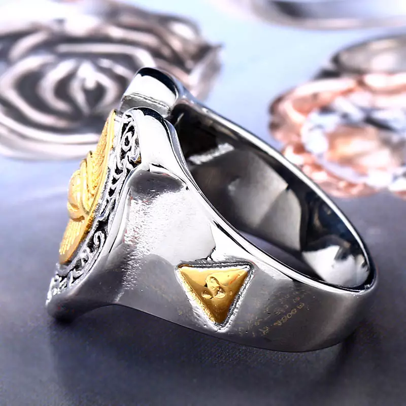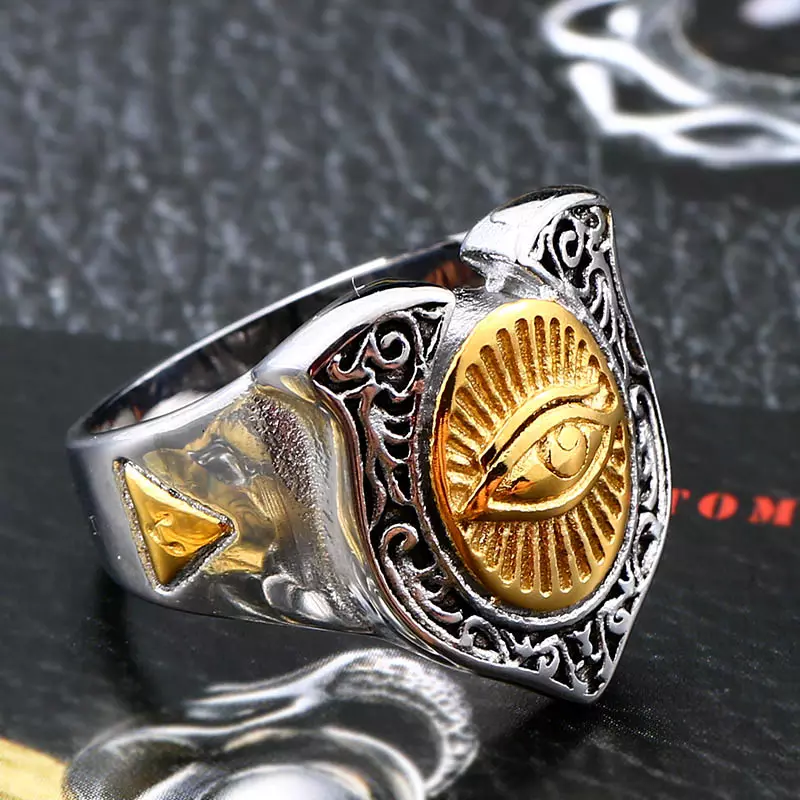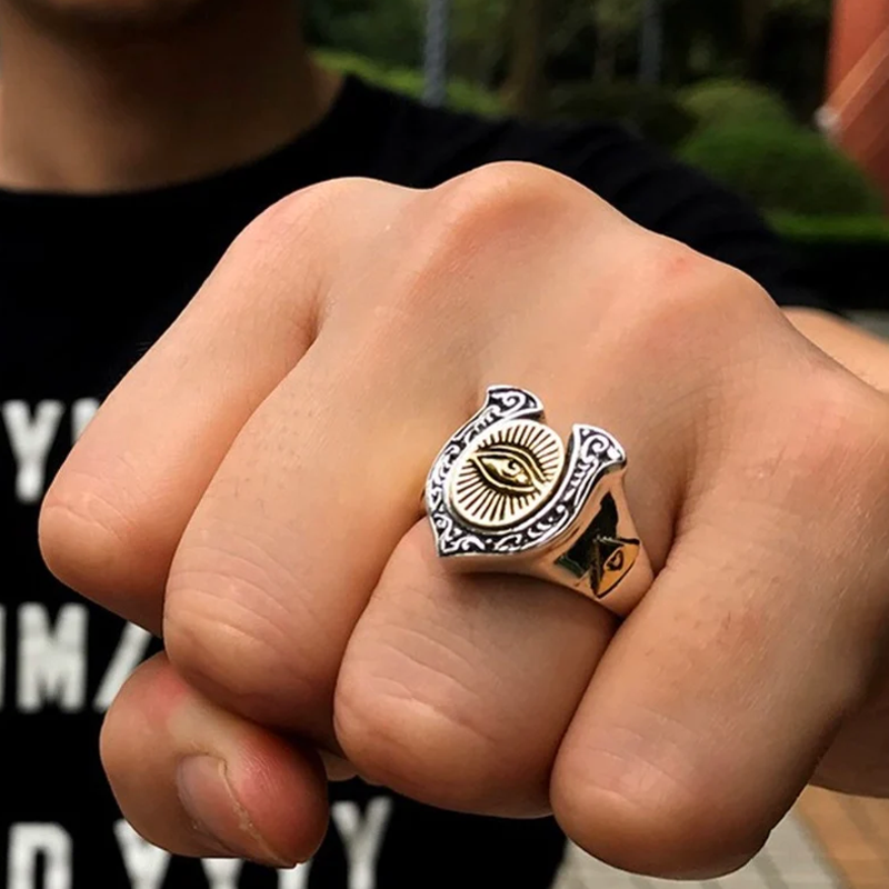 • Dieser atemberaubende, detaillierte Ring zeigt das ägyptische Auge des Horus als Mittelpunkt, das in einem Hufeisen-Design aufwärts geschöpft ist. Das Auge des Horus ist ein altes Symbol in der ägyptischen Folklore, das Abwehr von Bösem, Gesundheit und Schutz bedeutet und vom Gott Horus stammt.