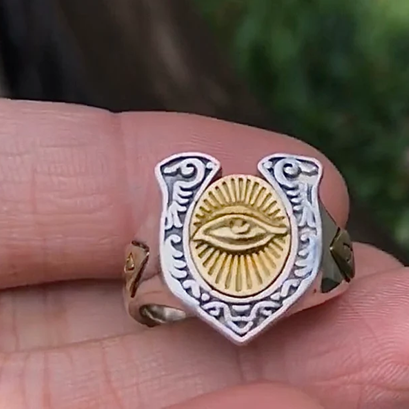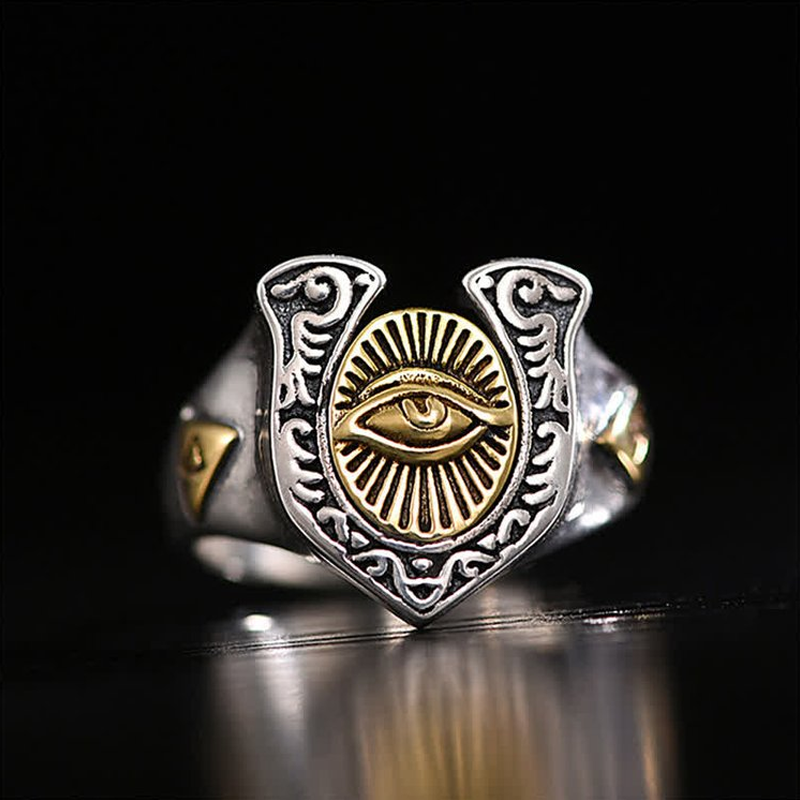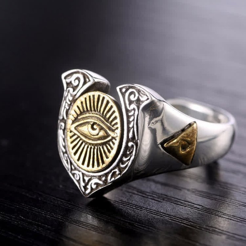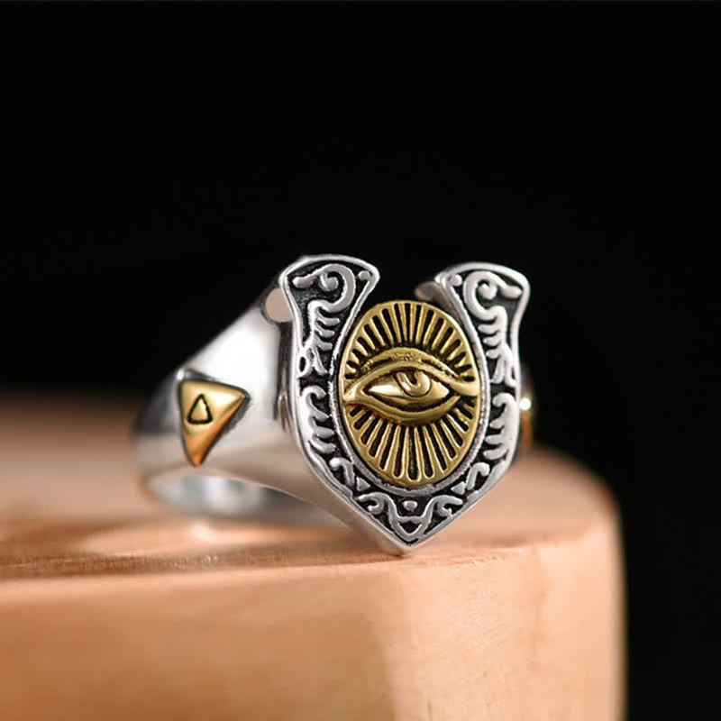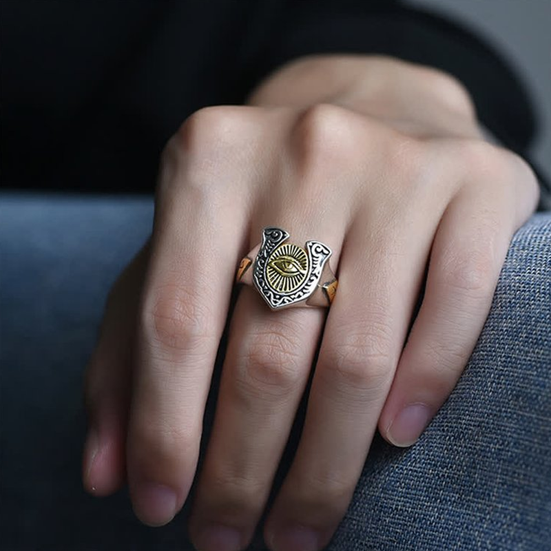 • Der Ring Auge des Horus ist aus hochwertigem Thai-Silber gefertigt, mit vergoldeten Elementen, die seine dekorative Struktur und seinen Stil verstärken. Das Augensymbol ist von einem silbernen Hufeisendesign umgeben. Es ist voll einstellbar und bietet daher einen hohen Tragekomfort.
