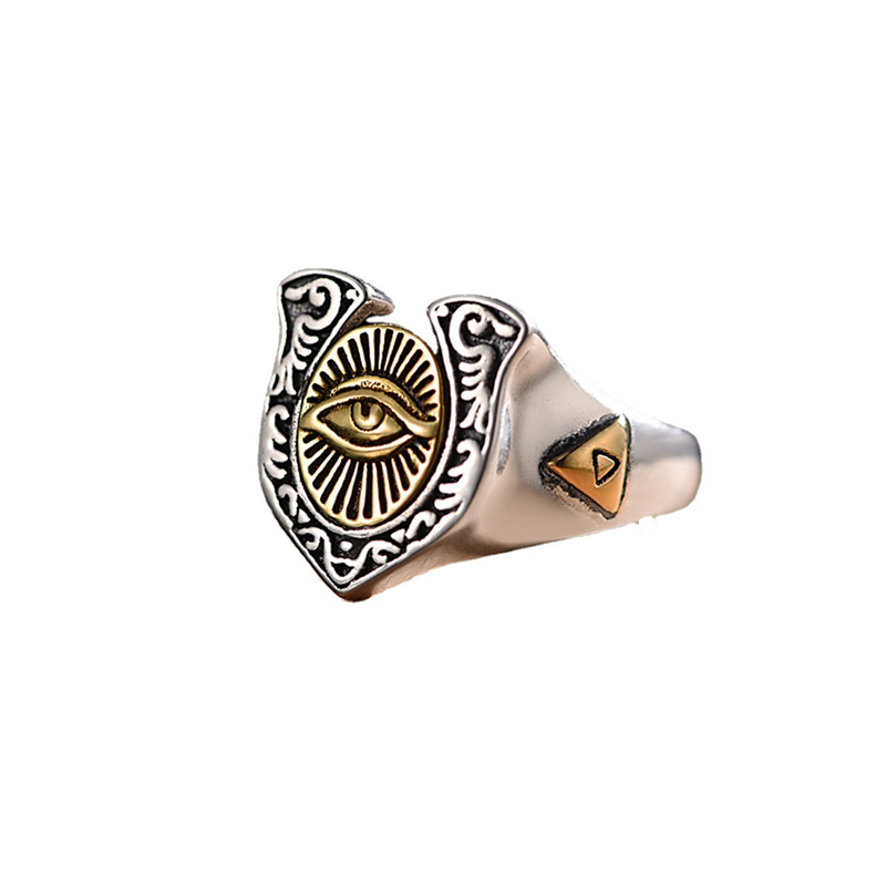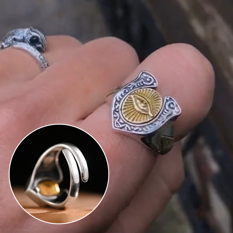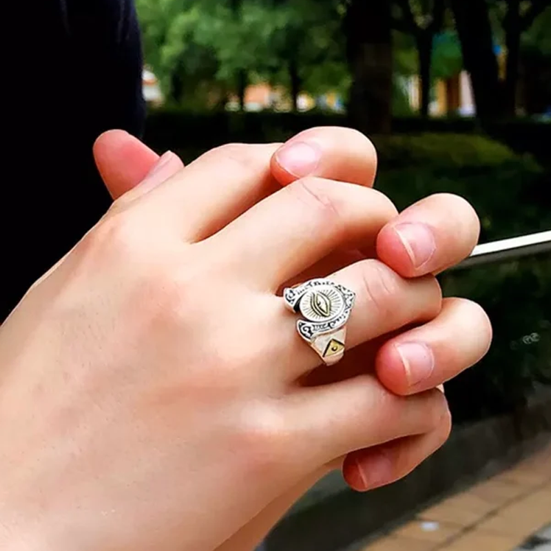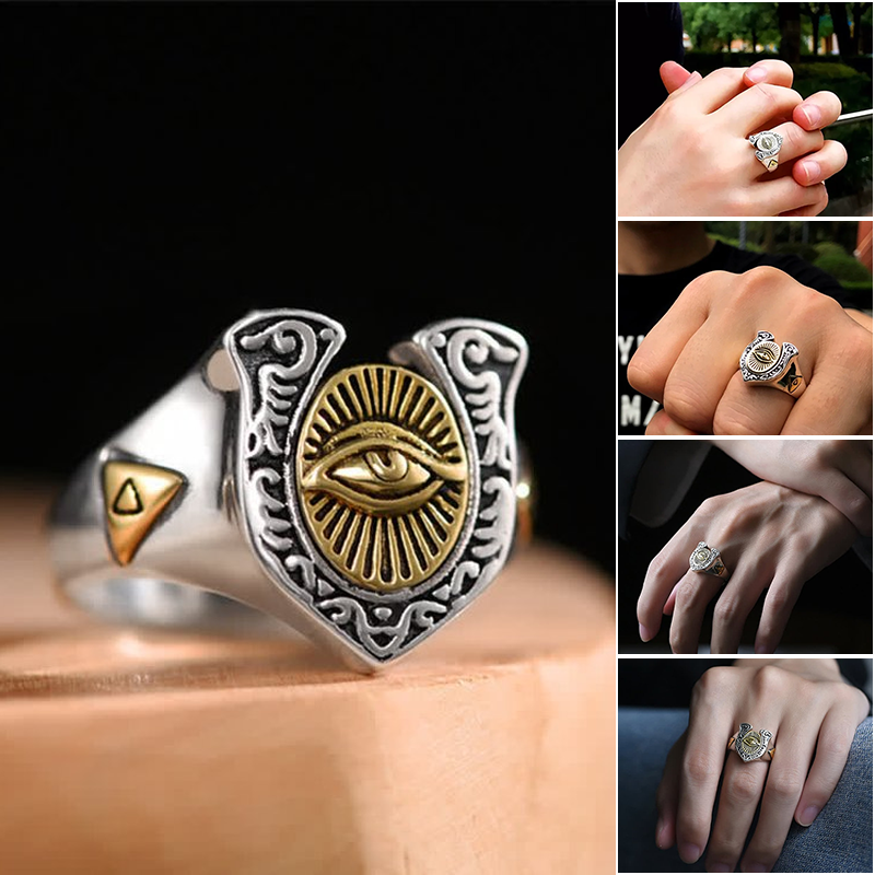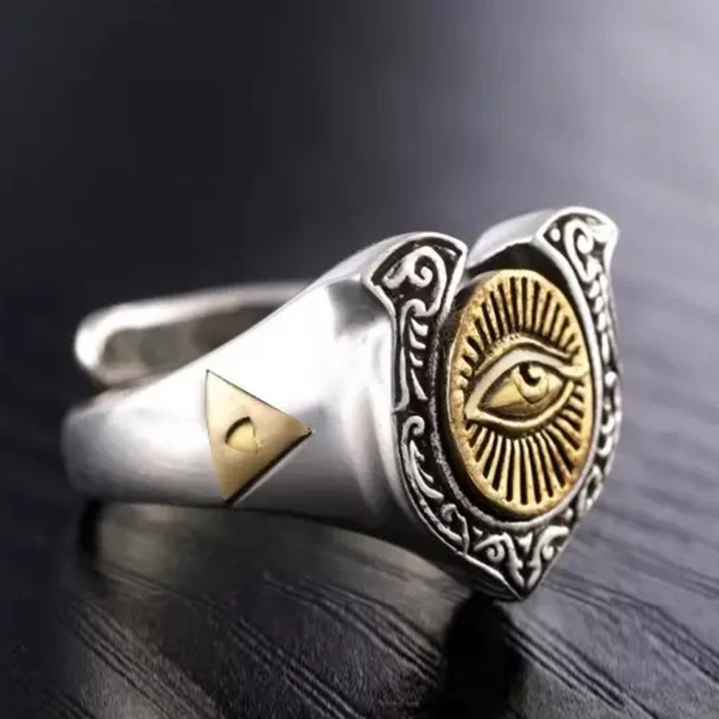 • Der Ring Auge des Horus ist aus hochwertigem Thai-Silber gefertigt, mit vergoldeten Elementen, die seine dekorative Struktur und seinen Stil verstärken. Das Augensymbol ist von einem silbernen Hufeisendesign umgeben. Es ist voll einstellbar und bietet daher einen hohen Tragekomfort.