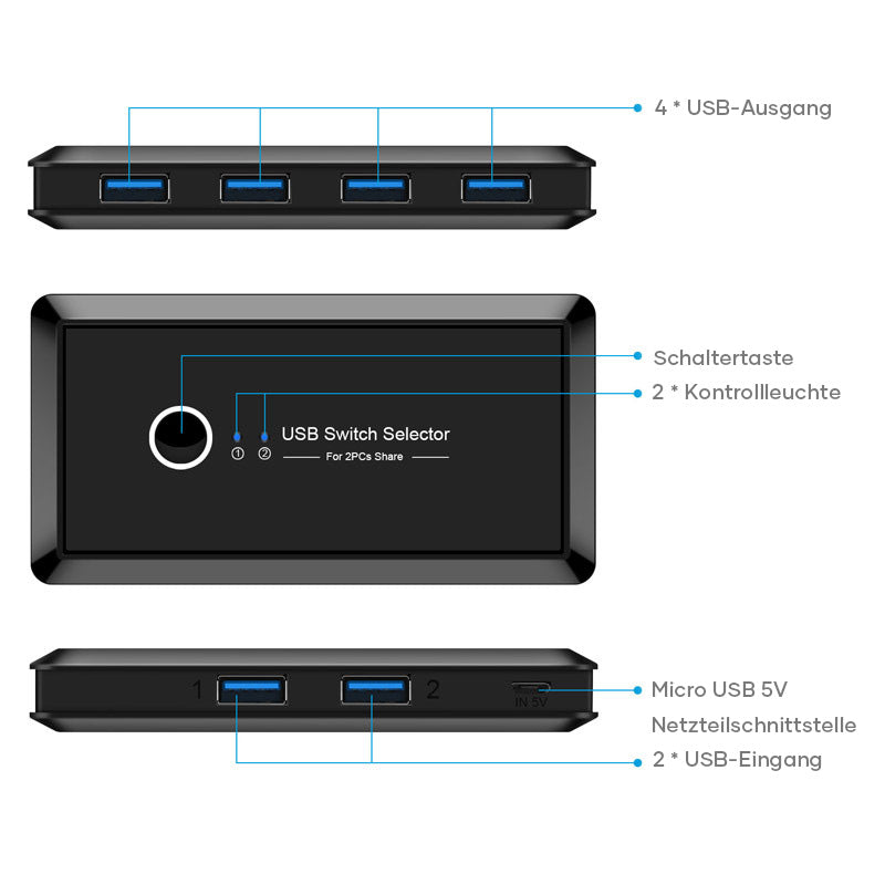 • Design: 2 Computer teilen sich 4 USB-Geräte gleichzeitig