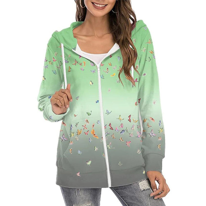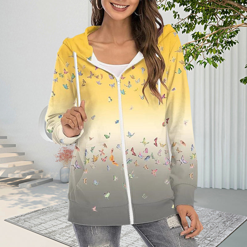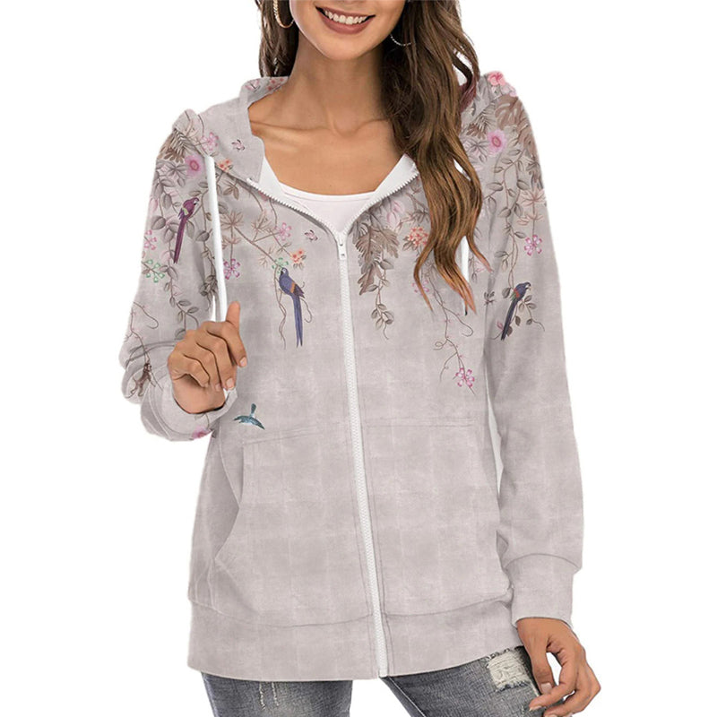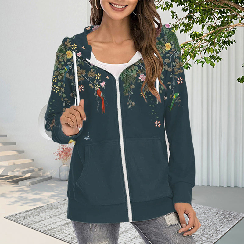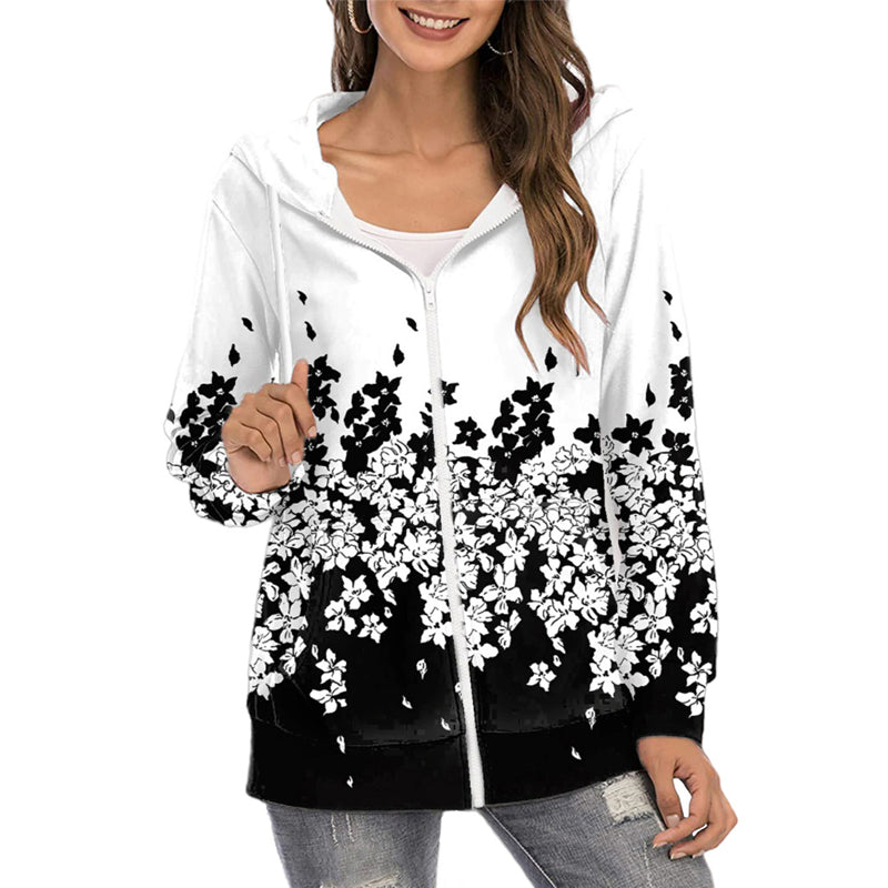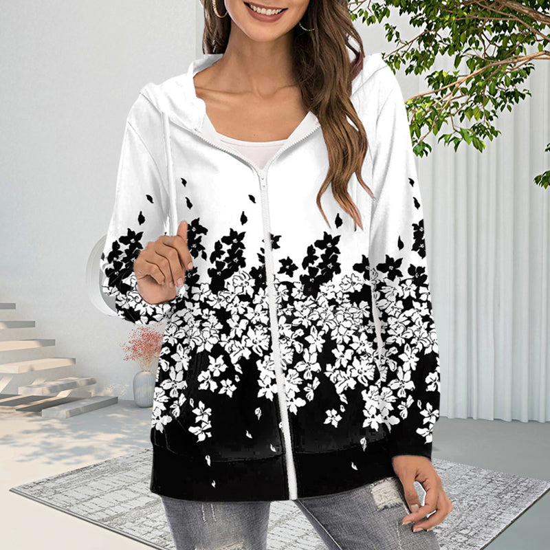 Produktmerkmale: Farbblockierung, lange Ärmel, durchgehender Reißverschluss, Batik, Kordelzug, gestreifter Druck, Blumenmuster.