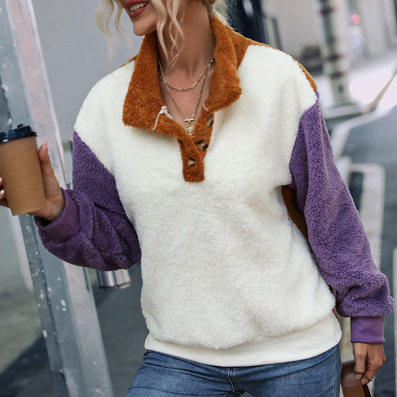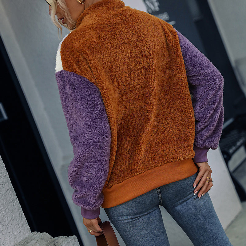 Lockerer Langärmliger Plüschpullover mit Rundhalsausschnitt und Farbblock