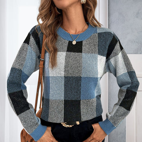Design: Klassisches Rundhals-Design, überschnittene Schultern, lange Ärmel, kariertes Druckmuster, gerippter Ausschnitt, Bündchen und Saum, taillierte Passform, Damenmode-Häkelpullover, lässiges Farbblock-Strickoberteil.