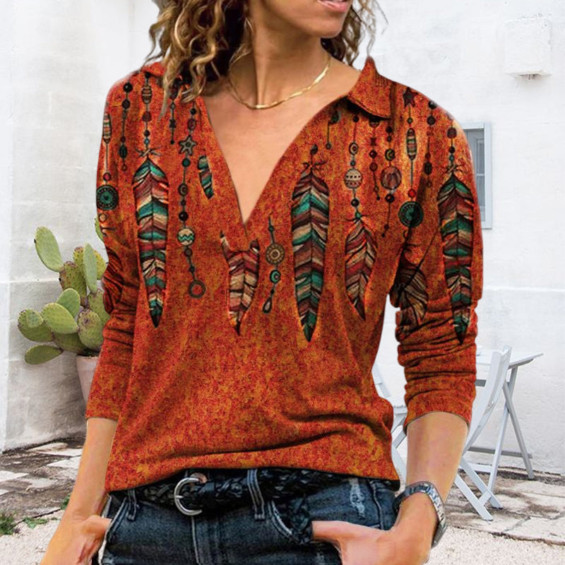 Eigenschaften: V-Ausschnitt, langärmliges Hemd, Westernhemd mit ethnischem Aufdruck, einfarbiger Retro-Stil, aber machen Sie charmanter, das Tragen dieses Damen-Westernhemdes wird nicht aus der Mode kommen.