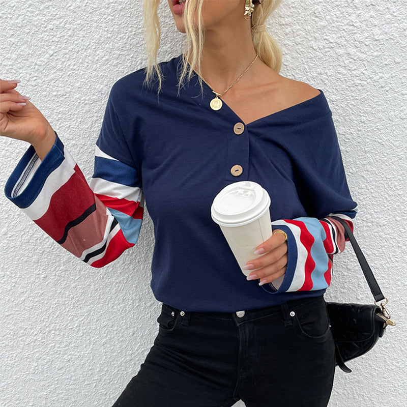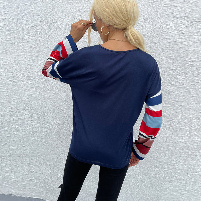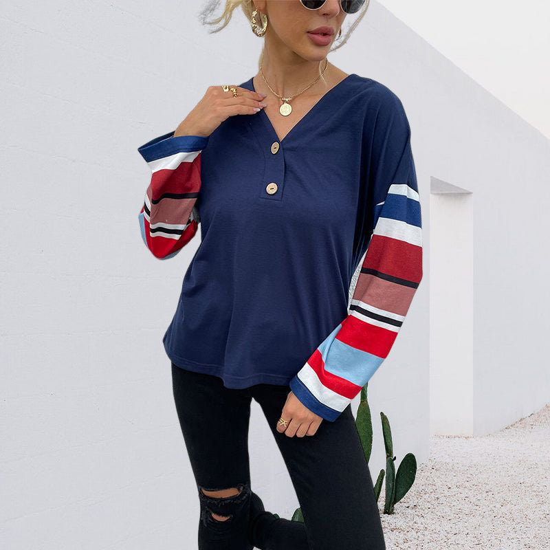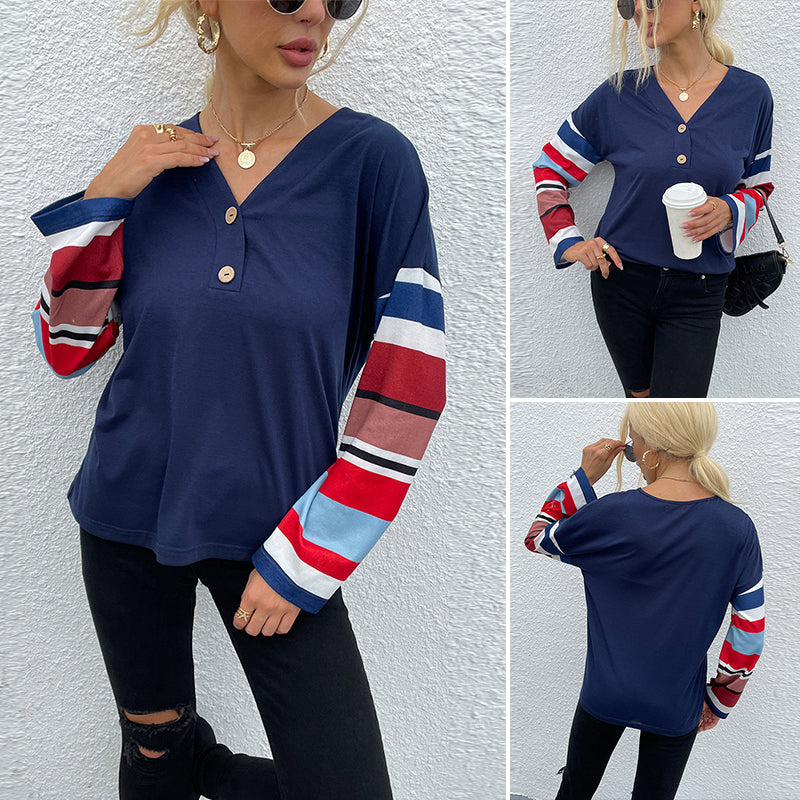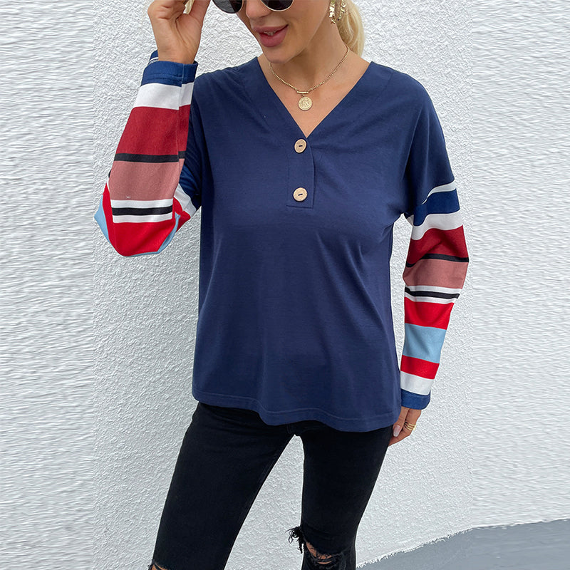 Damen T-Shirt mit V-Ausschnitt und gestreiften Ärmeln