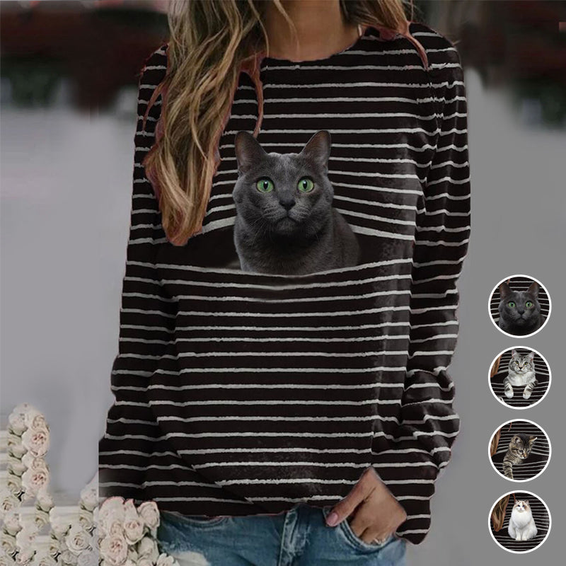 - 1 * Gestreiftes T-Shirt mit Katzen-Print