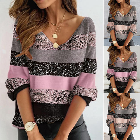 Eigenschaften: Farbblock-T-Shirt fĂŒr Damen, bedrucktes T-Shirt, Farbblock-T-Shirt, V-Ausschnitt, lange Ărmel, entspannte Passform.