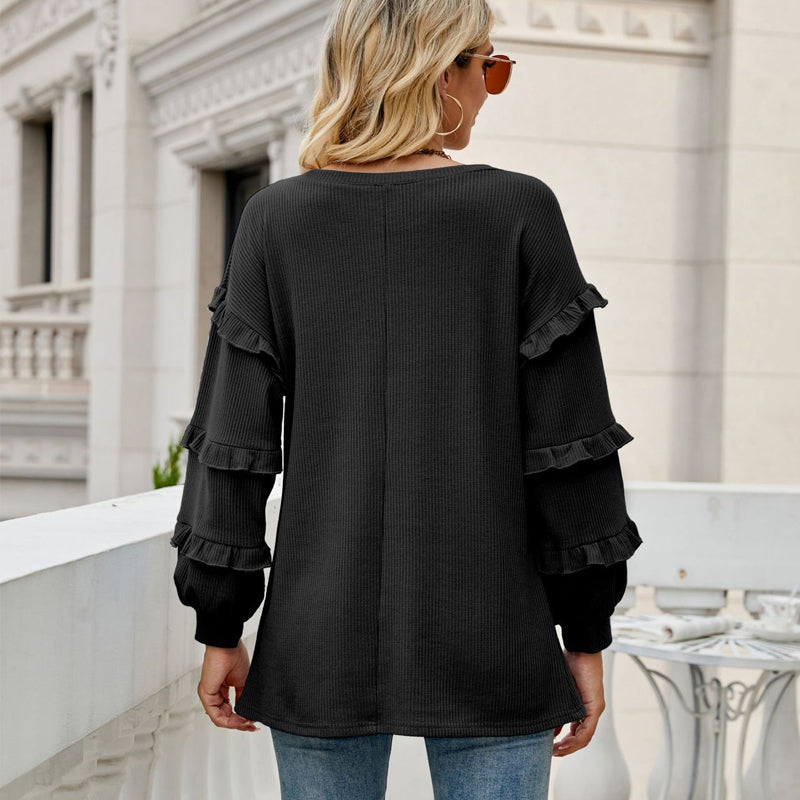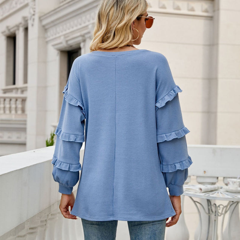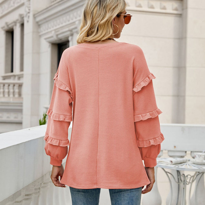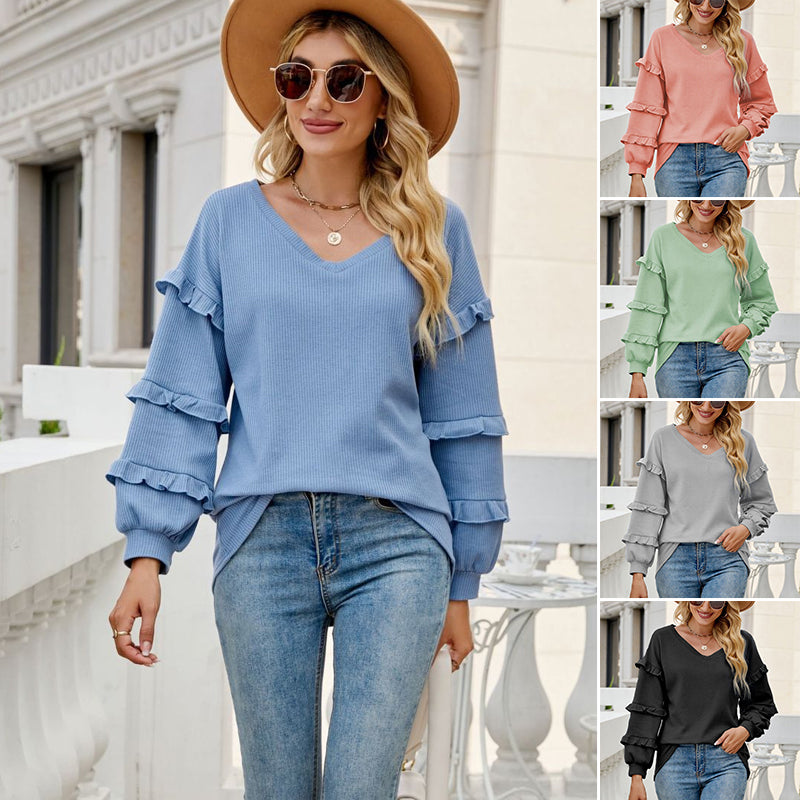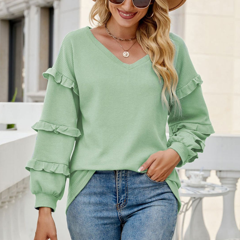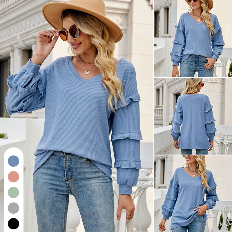 Weicher Stoff: Das lockere T-Shirt mit Waffelrüschen und V-Ausschnitt besteht aus Polyester, der Stoff ist weich und läuft beim Waschvorgang nicht wesentlich ein. Maschinenwäsche kalt / im Trockner bei niedriger Temperatur trocknen / Handwäsche empfohlen mit ähnlich farbigen Kleidungsstücken.