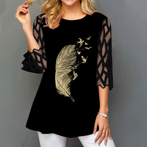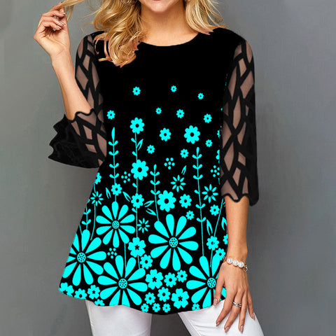 Design: Rundhalsausschnitt, kurze Ärmel aus Spitze, Blumendruck, geschwungener Saum, Oberteil mit Spitzenspleißen, einfaches Freizeithemd, das nicht am Bauch haftet, ein wenig fließend, wodurch Sie im Alltag eleganter und schöner werden, geeignet für Frühling, Sommer und Herbst , schnell trocknendes Basic-Top.