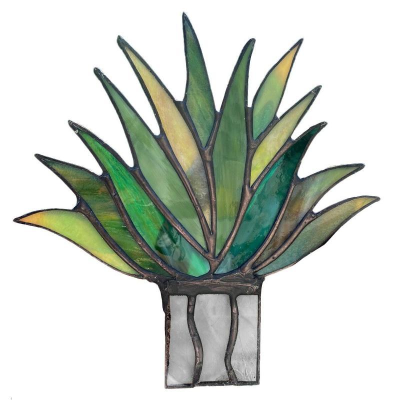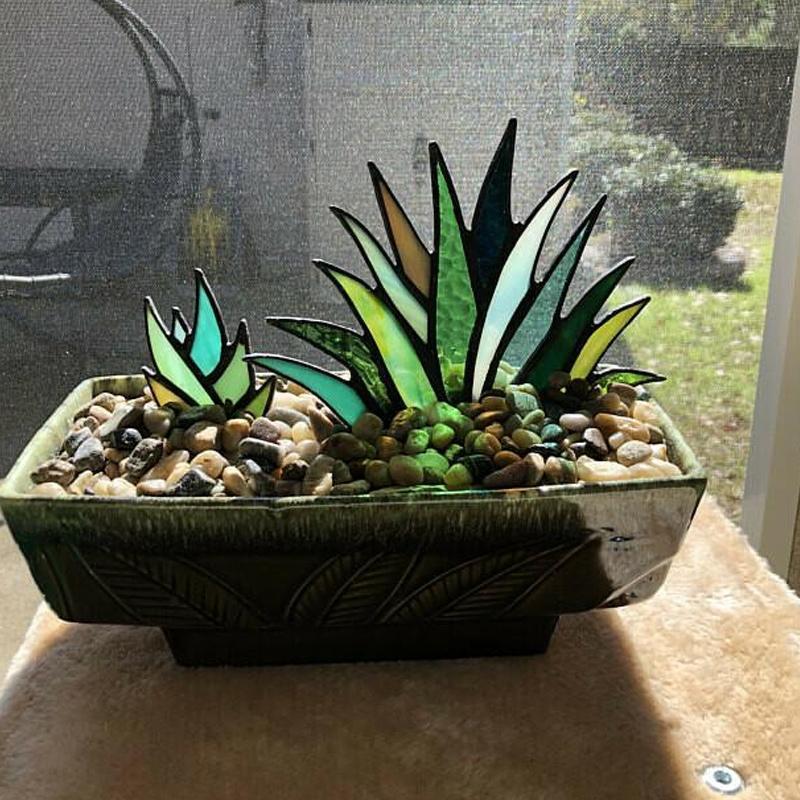 • Diese Buntglas-Agave/Aloe-Pflanze besteht aus handgeschliffenem Glas. Es gibt eine handgeschnittene Agave mit verschiedenen Grüntönen und gelblichem Glas. Die Farbe des Pflanzgefäßes ist Grün- und Brauntöne mit einem schönen geprägten Deko-Muster.