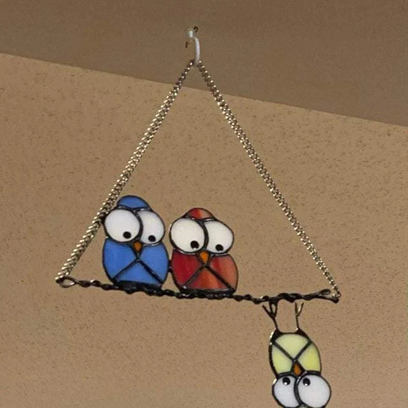 Es gibt drei niedliche Eulen an einer Eisenkette. Die Farben der Eulen sind blau, rot, grün. Es ist eine Familie von frechen Eulen, Eltern und Kindern. Sie werden gute Laune haben, wenn Sie sie jeden Tag sehen.