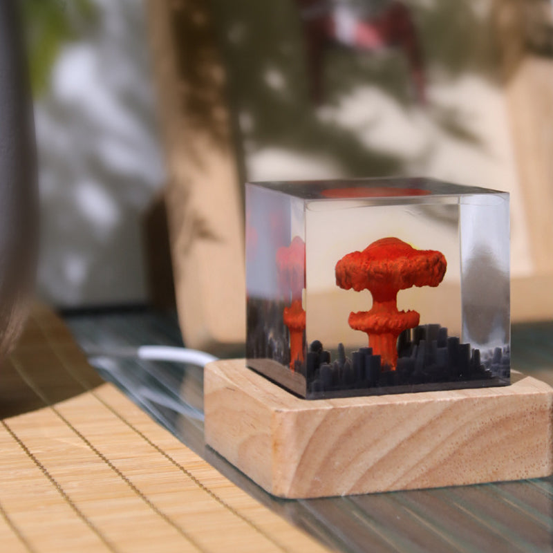 Lebendig und beeindruckend ist das, was Sie beim Betrachten und Berühren dieser Harzlampe spüren werden. Es ist atemberaubend real. Es gibt Gebäude, Straßen wie im echten Leben. Hat auch eine Pilzwolke, die für eine chemische Explosion charakteristisch ist.