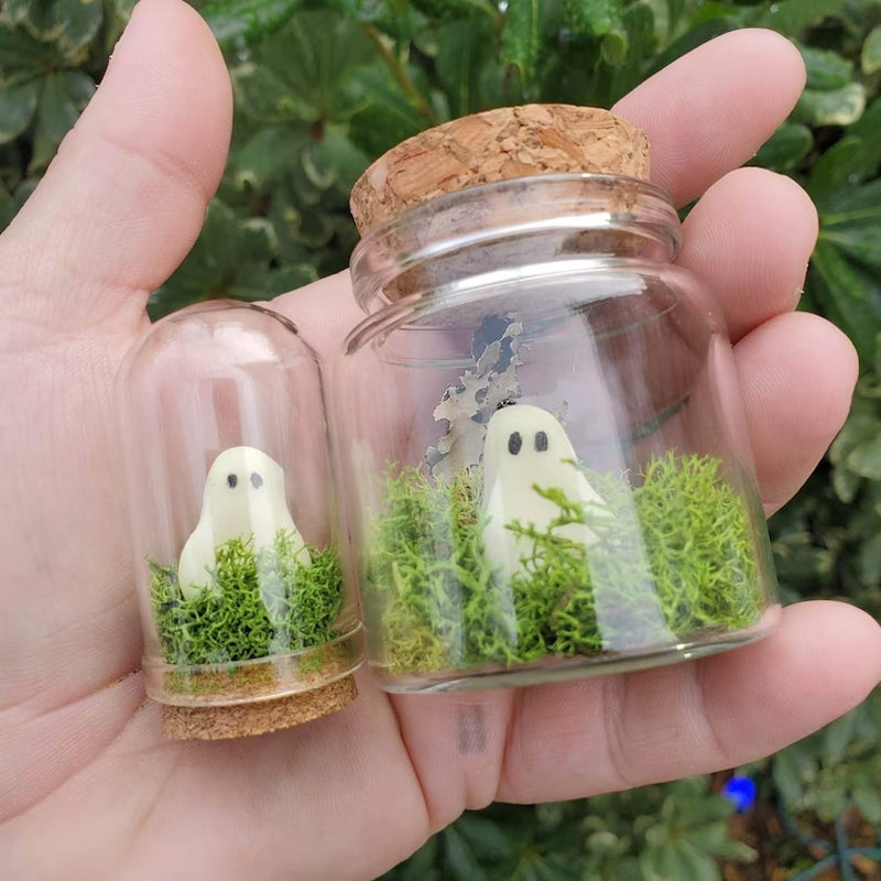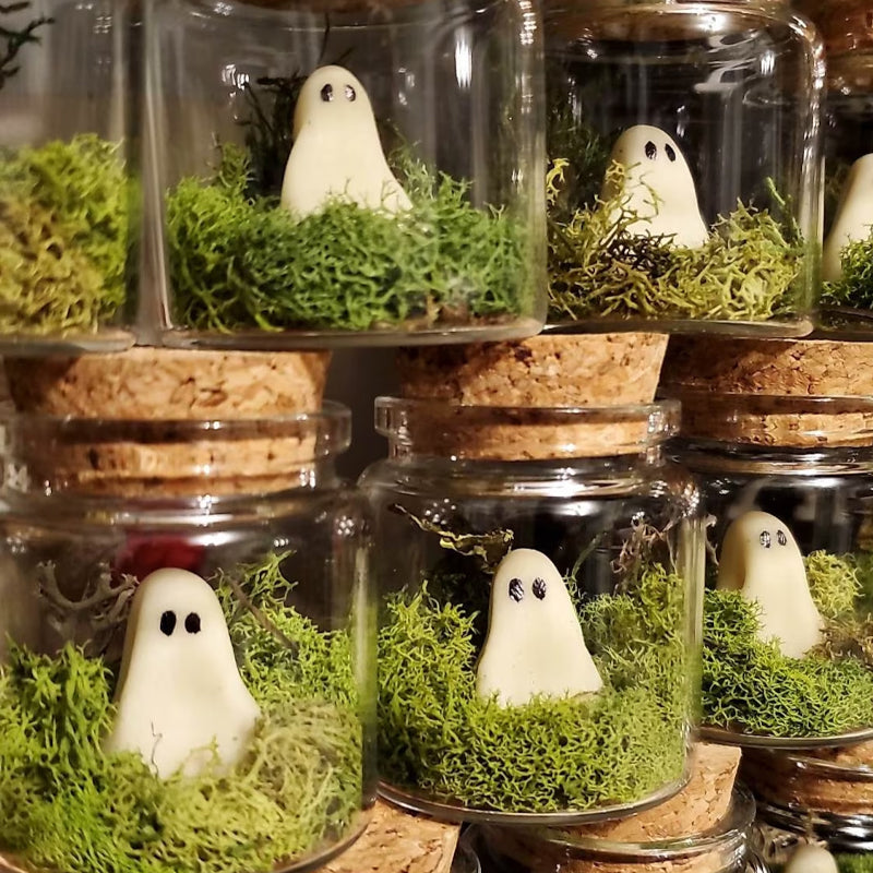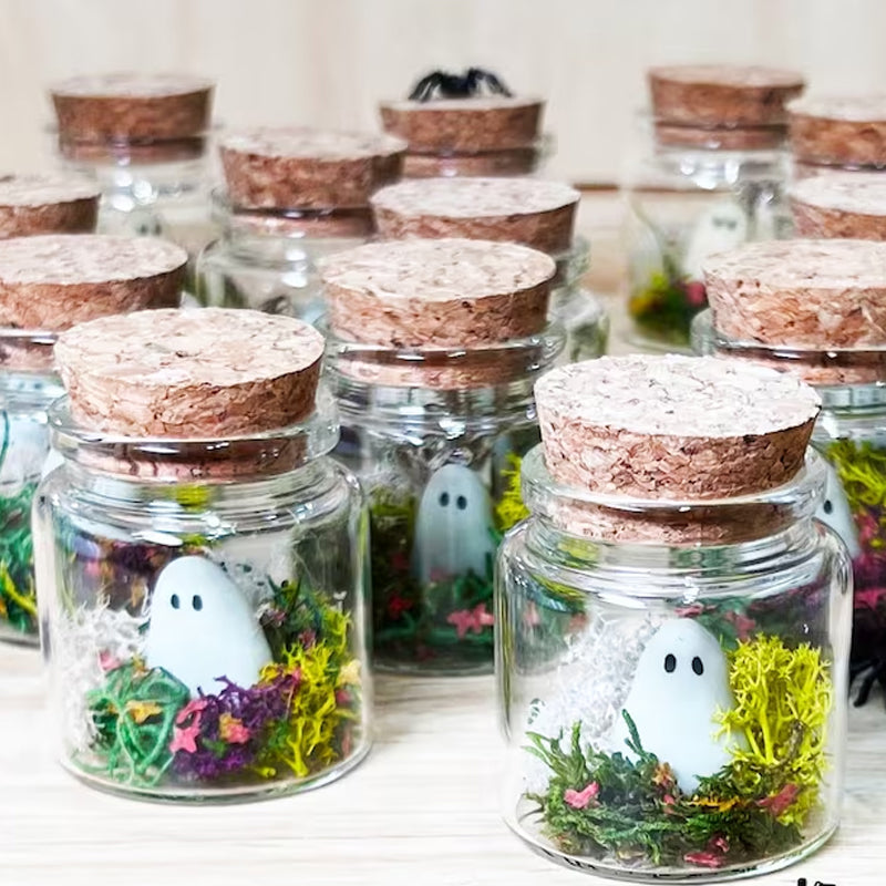 Basteln: Sie müssen nur künstliches Moos auf den Boden der Mini-Korkflaschen legen und dann das Gespenst in die Flasche setzen; Wenn Sie möchten, dass sie stabil sind, können Sie Kleber auf den Boden der Gespenster auftragen und sie auf den Boden der Glasflasche kleben.