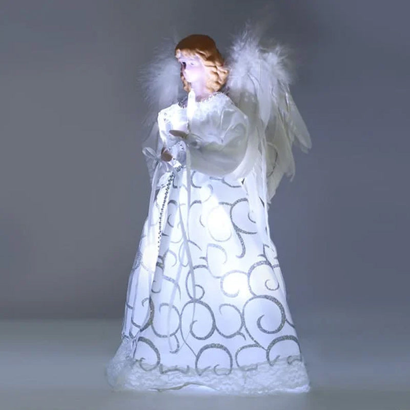 • Dieser wunderschöne Engel trägt ein weißes Kleid aus echtem Stoff mit silbernen Akzenten und sportlich schillernden Flügeln.