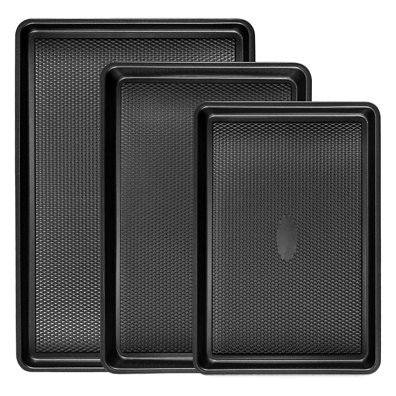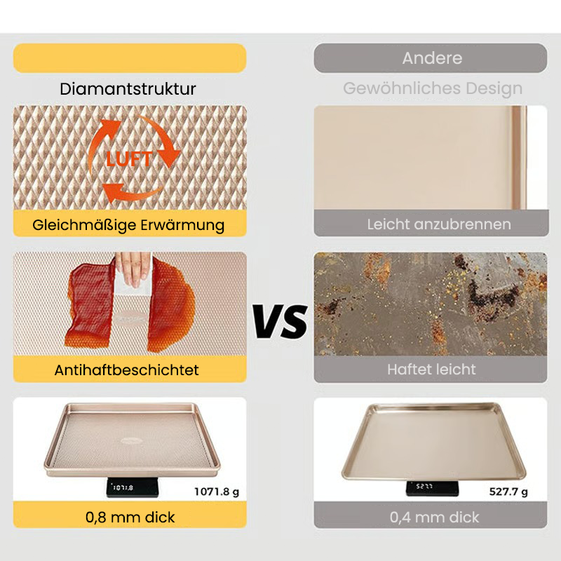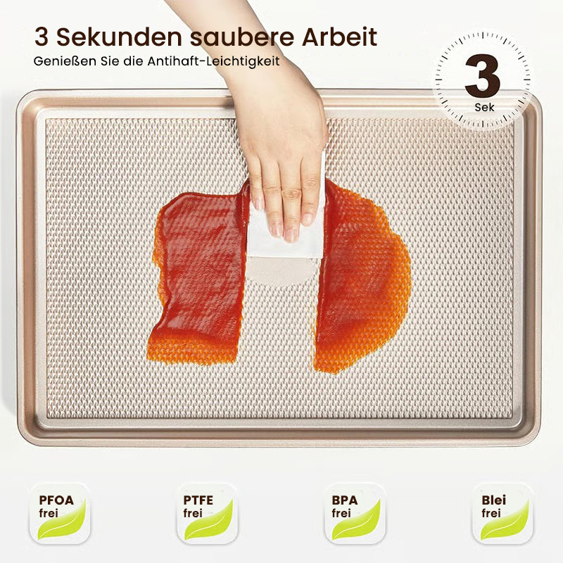 Innovative Diamantstruktur: Das Backblech-Set verfügt über eine Diamantstruktur am Boden, die die Antihaft-Eigenschaften verbessert und eine gleichmäßige sowie schnelle Wärmeverteilung zum Gebäck gewährleistet. Dadurch werden die Kekse gleichmäßig gebacken, ohne dass sie an irgendeiner Stelle über- oder unterbacken sind.
