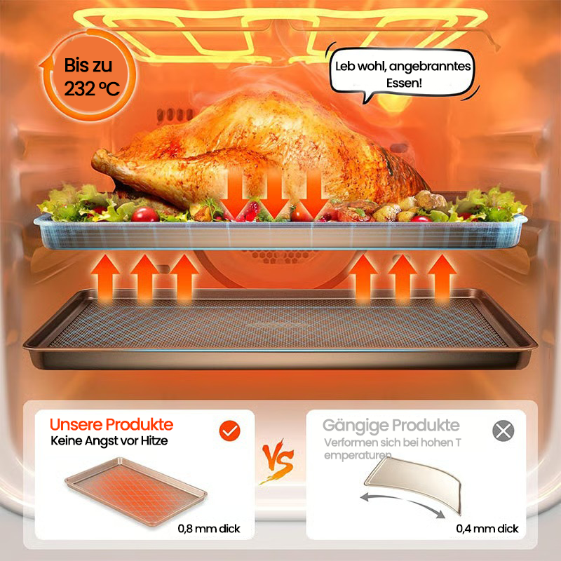 Hochwertiges, extra dickes Material: Diese langlebigen Ofenbleche bestehen aus 57 % dickerem Kohlenstoffstahl und sind aus schwerem Kohlenstoffstahl gefertigt, um Stabilität, gleichmäßige Wärmeverteilung und Langlebigkeit über viele Jahre zu gewährleisten. Garantie gegen Ablösen bei hitzebeständiger Temperatur: 450 ℉ (ca. 232 °C).