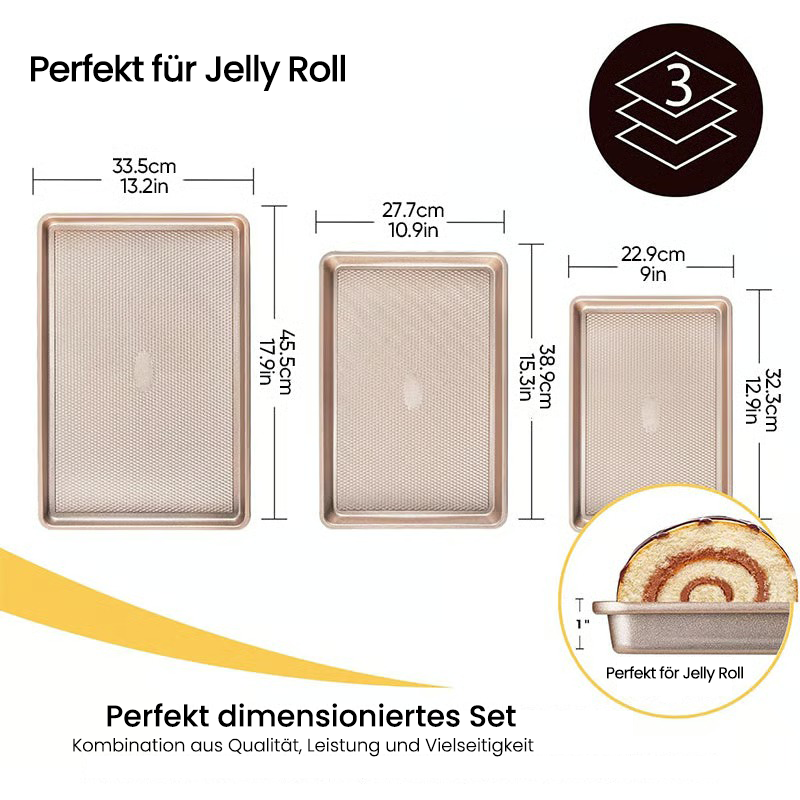 Exklusives Komplettset: Dieses Backblech-Set enthält 3 antihaftbeschichtete Backbleche. Sie sind genau richtig dimensioniert: klein zum Backen von Keksen, Gebäck und Lasagne, mittelgroß zum Backen von Biskuitrollen und groß zum Backen von Hühnchen und Gemüse. Mit nur einem Set können Sie ganz einfach Ihre täglichen Backbedürfnisse erfüllen und Ihr Backerlebnis auf die nächste Stufe heben.