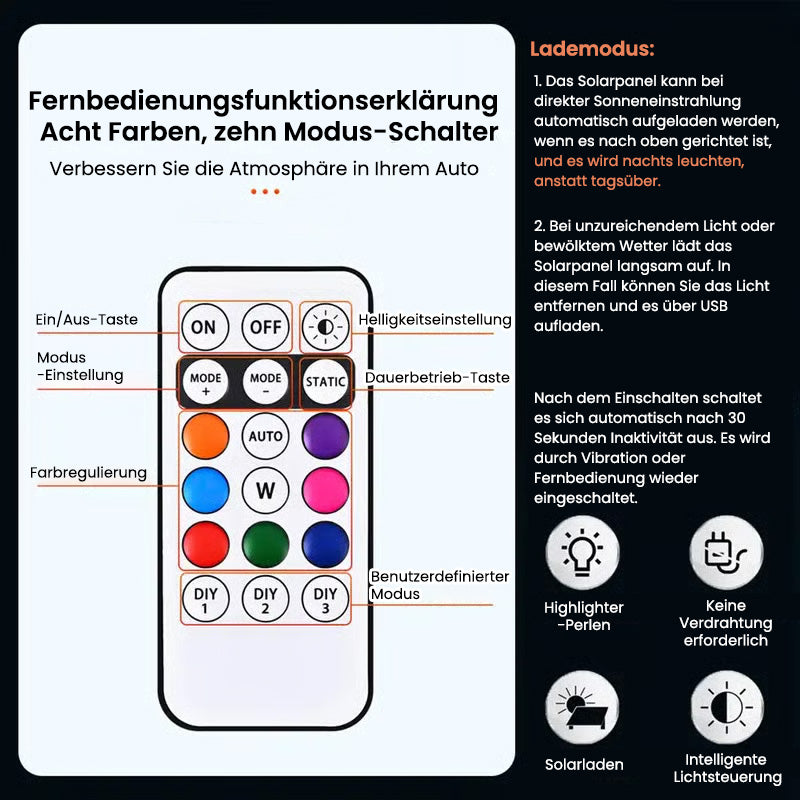 Dieses Solar Auto-Dach RGB-Stroboskoplicht ist eine innovative Lösung zur Warnung und Verbesserung der Sichtbarkeit ohne Installation. Es nutzt intelligente Sensoren und fernbedienbare RGB-Stroboskopfunktionen, um sowohl die Sicherheit als auch eine vielseitige Innenbeleuchtung für Fahrzeuge und Outdoor-Aktivitäten zu gewährleisten.