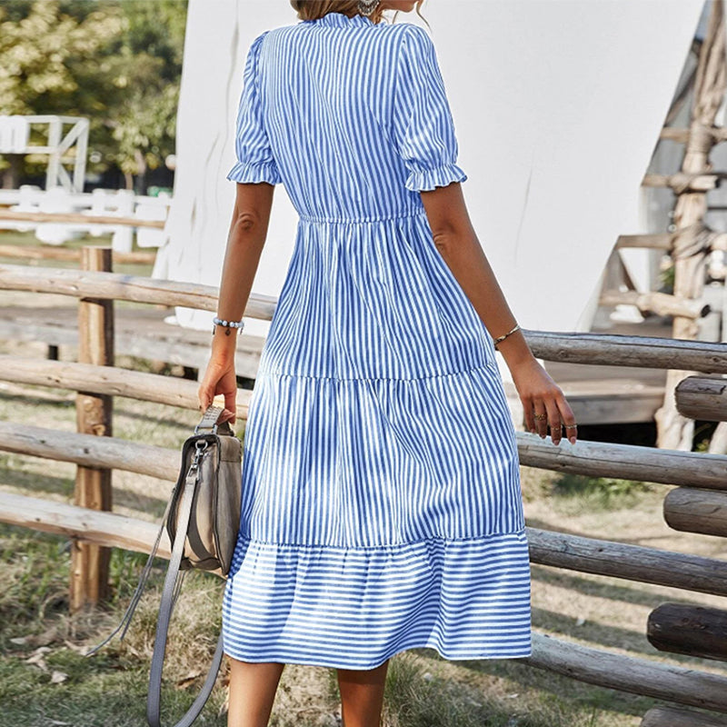 • Design: Einfaches, leichtes Button-Down-Kleid für Damen. Kurzarm-Midirockhemd mit Reverskragen, einreihiger Streifendruck, hoch und niedrig vorne und hinten, zeitlos und einzigartig.
