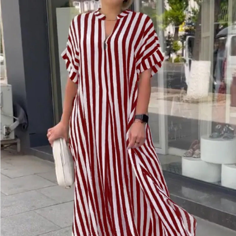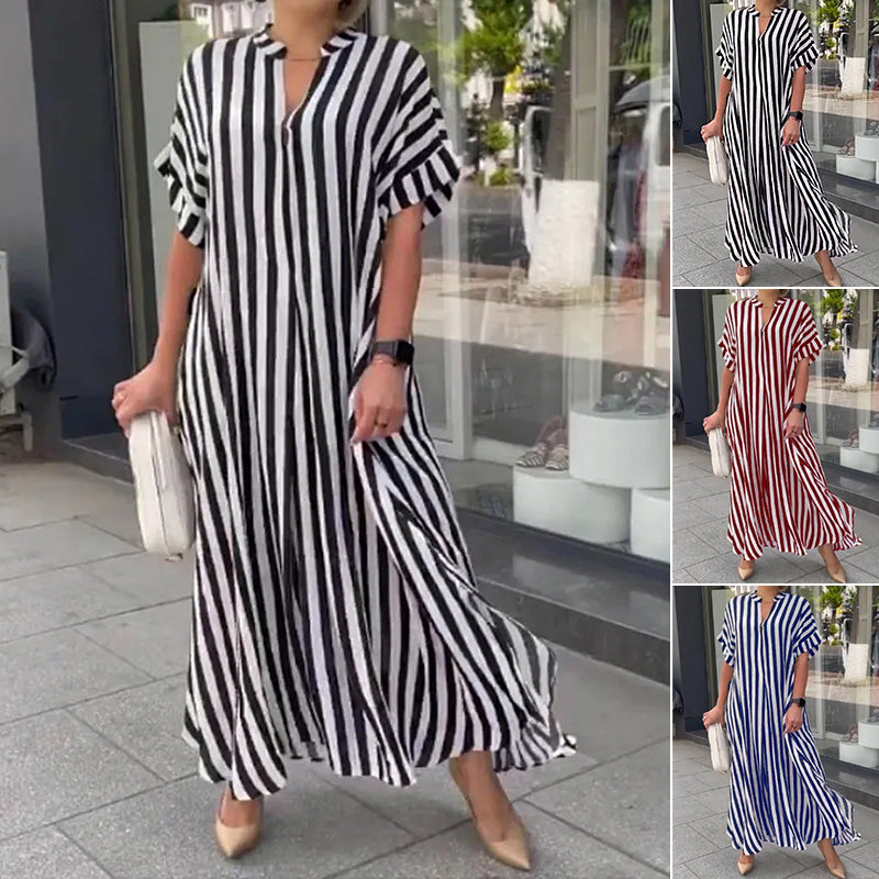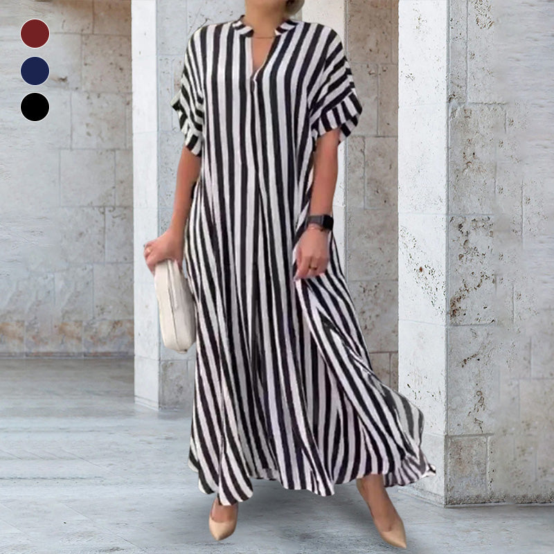 Das Streifenmuster verleiht einen Hauch klassischen Charmes, während die kurzen Ärmel für Leichtigkeit und Luftigkeit sorgen. Dieses Kleid mit stilvollen Seitenschlitzen bietet Bewegungsfreiheit und einen modernen Touch.