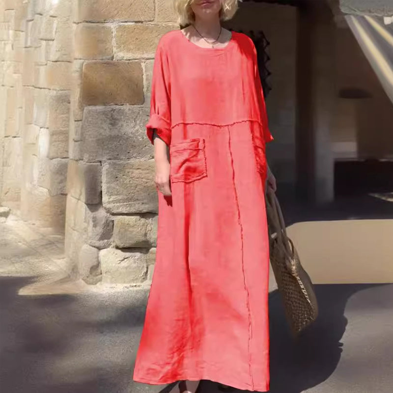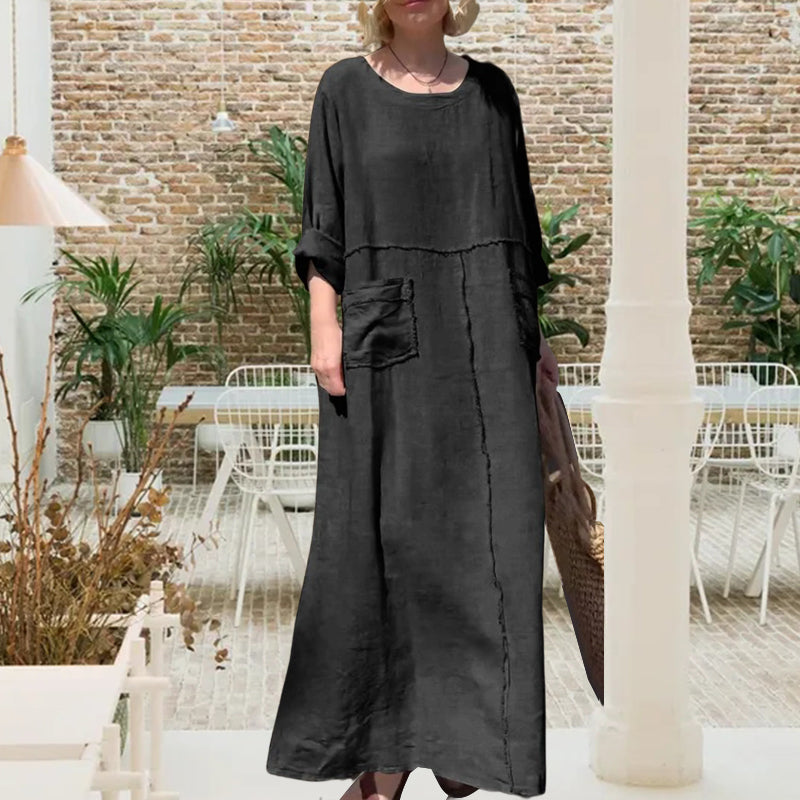 Dieses aus hochwertiger Baumwolle und Leinen gefertigte Kleid strahlt zeitlose Eleganz aus. Vielseitig und raffiniert passt es sich mühelos jedem Anlass an.