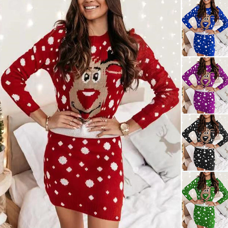ღ MODEMERKMALE: Weihnachtsdrucke, Pullover, Rundhalsausschnitt, lange Ärmel, knielang, Strickpulloverkleider