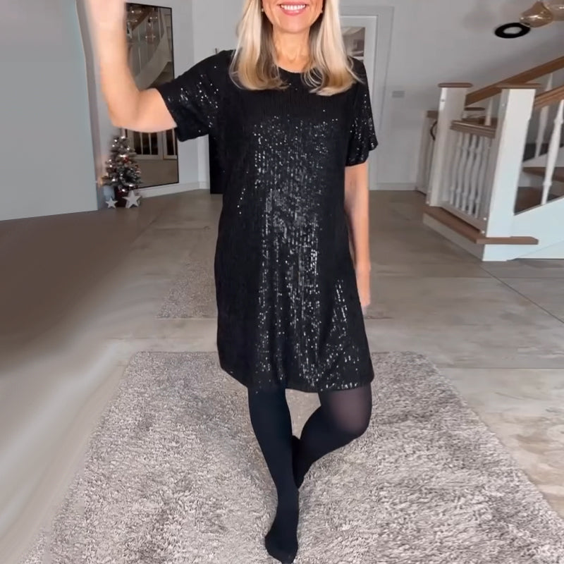 DESIGN: Das kurzärmlige Babydoll-Kleid für Damen, Rundhalsausschnitt, glänzendes Paillettenkleid für Damen, Mini, Glitzer-Hemdkleid, einzigartig und attraktiv.