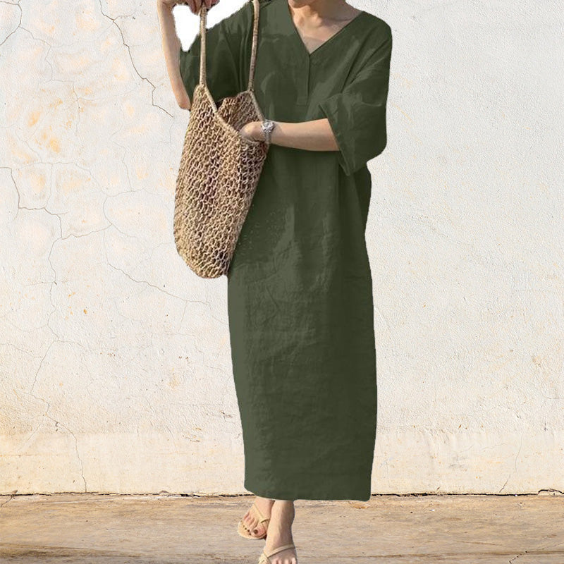 • 1 * Sommerkleid mit V-Ausschnitt aus Leinen und Baumwolle