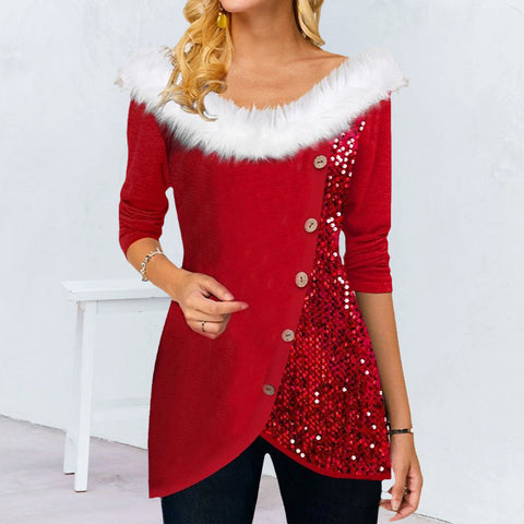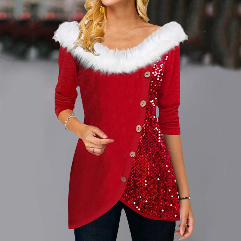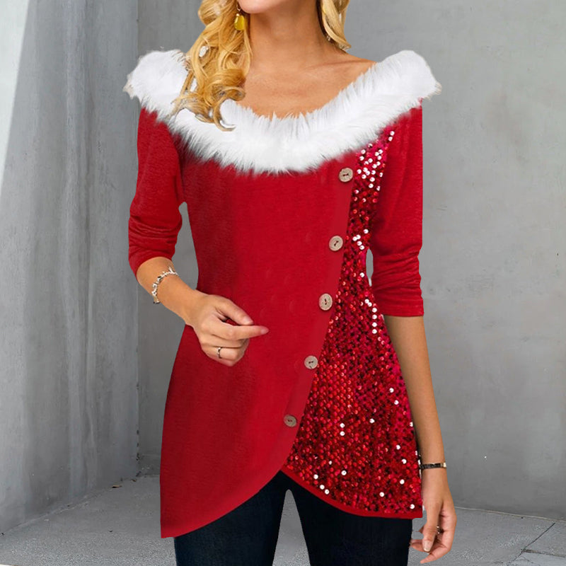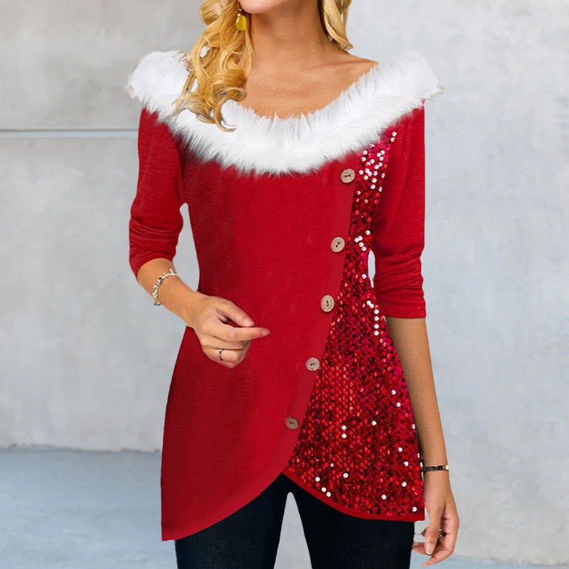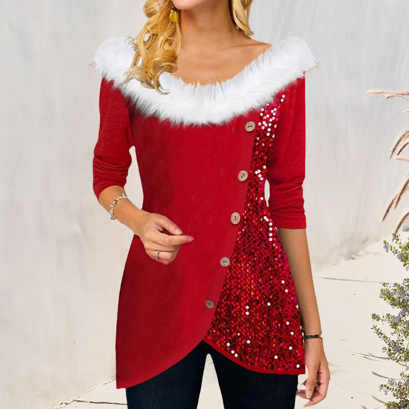 Weihnachtsoberteil mit Pailletten und Pelzkragen