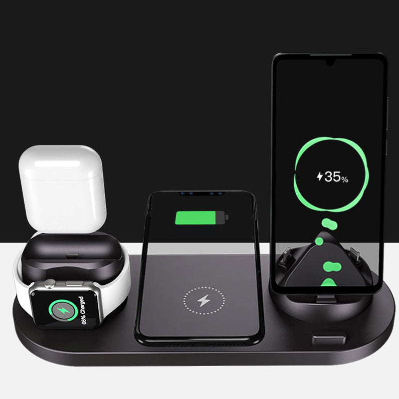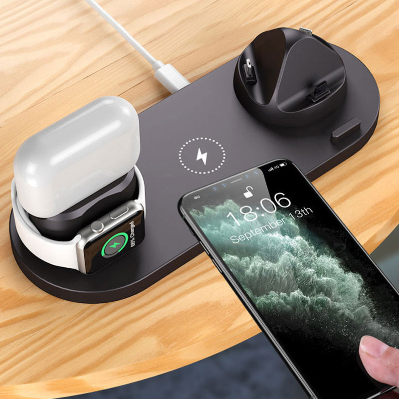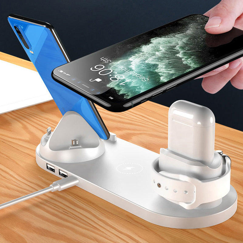 Dieser multifunktionale kabellose 6-in-1-Ladeständer mit integriertem Magnetladegerät ist aus hochwertigen Materialien gefertigt und nimmt sehr wenig Platz ein. Es kann problemlos Ihr Telefon, Ihre Apple Watch und Ihre AirPods gleichzeitig aufladen.