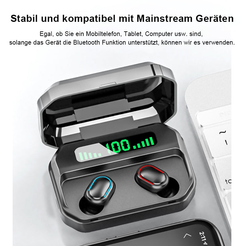 Bluetooth 5.1 - Bluetooth 5.1 werden kombiniert, um eine stabile Verbindung zwischen dem echten drahtlosen Ohrhörer und dem Smartphone zu gewährleisten. Leistungsstarker Chip sorgt für eine Bluetooth-Signalverzögerung von nur 50 ms. Die Übertragungsgeschwindigkeit ist doppelt so hoch wie bei den alten kabellosen Bluetooth Kopfhörern. Die Bluetooth-Reichweite beträgt bis zu 10 m. Verabschieden Sie sich vom Kabelsalat und begrüßen Sie die Bewegungsfreiheit.