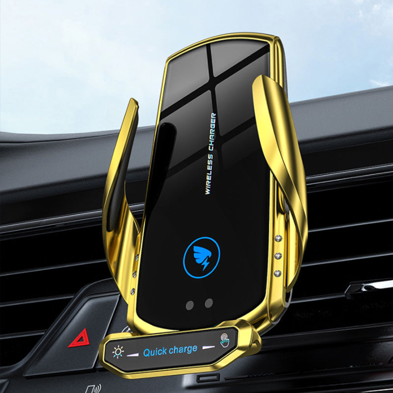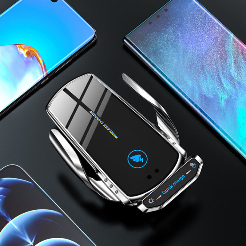 Dieser Handyhalter verwendet Infrarot-Sensortechnologie mit einer Reichweite von 10 cm. Wenn sich das Mobiltelefon in der Nähe des Erkennungsbereichs befindet, öffnet sich der Telefonhalter automatisch und fixiert das Telefon. Berühren Sie die linke Metalltaste, der Induktionssitz wird automatisch freigegeben.