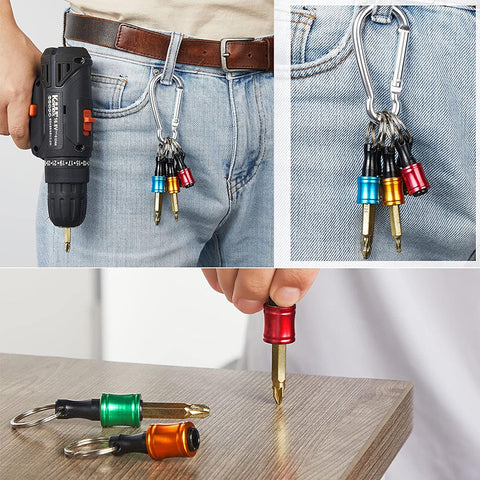 - 🛠️ Mühelose Organisation: Schluss mit der lästigen Suche nach dem richtigen Bohrer! Im Inneren dieses Karabiners befinden sich sechs präzisionsgefertigte Bithaltereinsätze, die jeweils mit einem Schnellverschluss ausgestattet sind.