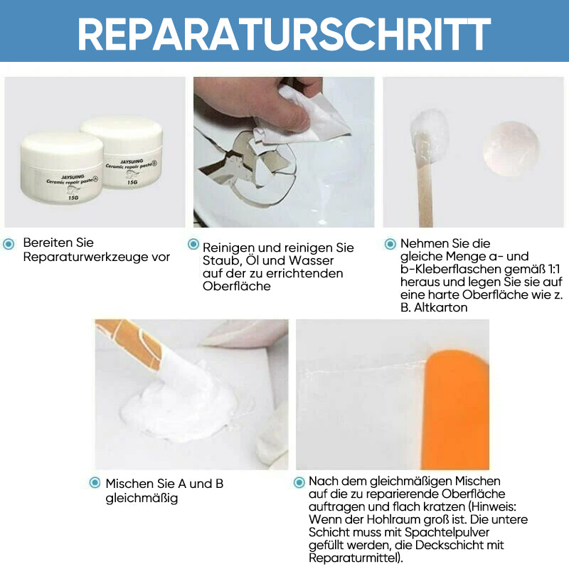 • Anwendung - Zum Reparieren von Chips, Kratzern, Dellen, Rissen, abgenutzten Teilen und Löchern auf allen Keramikoberflächen wie Badewannen, Fliesen, Duschen, Wannen, Waschtischen, Waschbecken. Auch geeignet für GFK, Stein, Kunststoff.