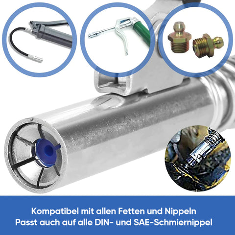 Kompatibel mit allen Fettwerkzeugen und -düsen: 1/8 NPT passt auf alle Standard-Schmierwerkzeuge, einschließlich Mini-Schmierwerkzeuge. Es funktioniert auch mit allen DIN- und SAE-Schmiernippeln. Ersetzen Sie einfach vorhandene Schmierwerkzeuganschlüsse.