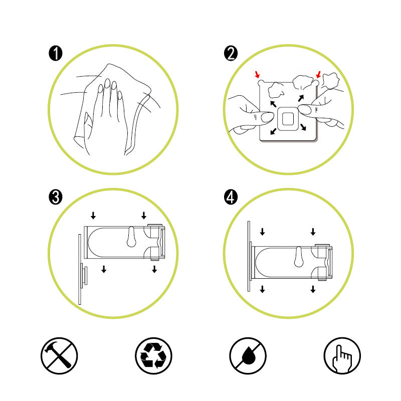 Der spurlose Mopphalter muss fest geklebt werden, ohne die Wand zu beschädigen, und der spurlose Flicken muss frei von Nägeln und Klebstoff sein.