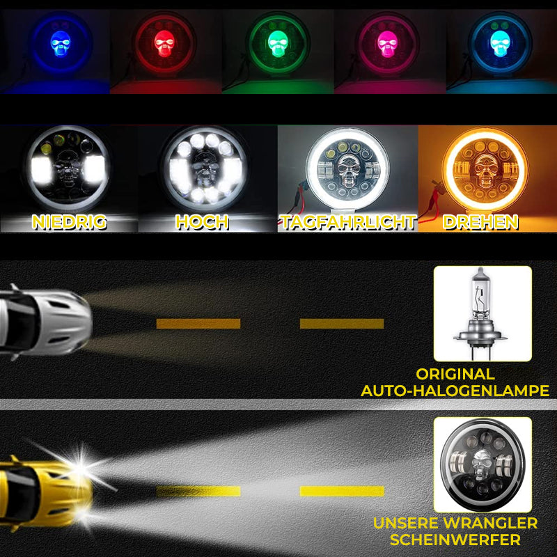 Der neu gestaltete 7-inch-Schädelscheinwerfer ist vielseitig und kann an jedem Fahrzeug montiert werden, das derzeit über einen 7-inch-Scheinwerfer oder einen benutzerdefinierten 7-inch-Montagebereich verfügt. Es ist ideal für Anwendungen wie Jeeps, Oldtimer und Motorräder.