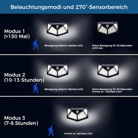 3 intelligente Beleuchtungsmodi: Solarlicht erkennt Bewegungen effizient und schnell. Es gibt 3 Modi: Starklichtmodus, Sensormodus für schwaches Licht, Sensormodus für starkes Licht, um Ihren Anforderungen gerecht zu werden