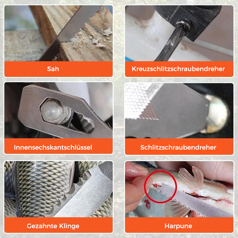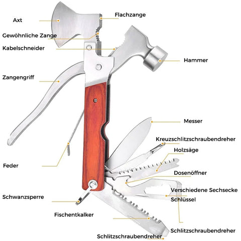 【16-IN-1-MEHRZWECKWERKZEUG】 Kann als Axt, (Notfall-)Hammer, Zange (Flachbackenzange, normale Zange und Drahtschneidezange), Messer, Klinge, Säge, verschiedene Inbusschlüssel, Kreuzschlitzschraubendreher, Schlitzschraubendreher, Flasche verwendet werden Öffner, Nagelfeile, Fischschupper und mehr, um unterschiedlichen Anforderungen gerecht zu werden.