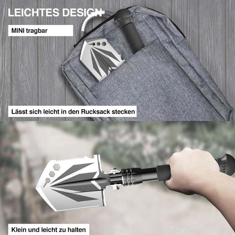 • - Multifunktional: Schaufel, Hacke, Hammer, Säge, Cutter, Schraubendreher, taktisches Messer, Pfeife, Kompass, Flaschenöffner, Funkenstab, Eispickel, Drahtschneider usw.