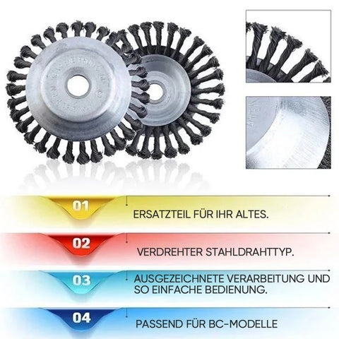 • Einzigartiges Design: Dieser Trimmerkopf besteht aus verseiltem Stahldraht mit 36 ​​Bürstenklingen. Es wurde für schnelle und einfache Arbeiten oder schwierige Arbeiten entwickelt, die einen turbobetriebenen Strahl erfordern. Für dieses Produkt ist keine Aufgabe zu groß oder zu schwierig.