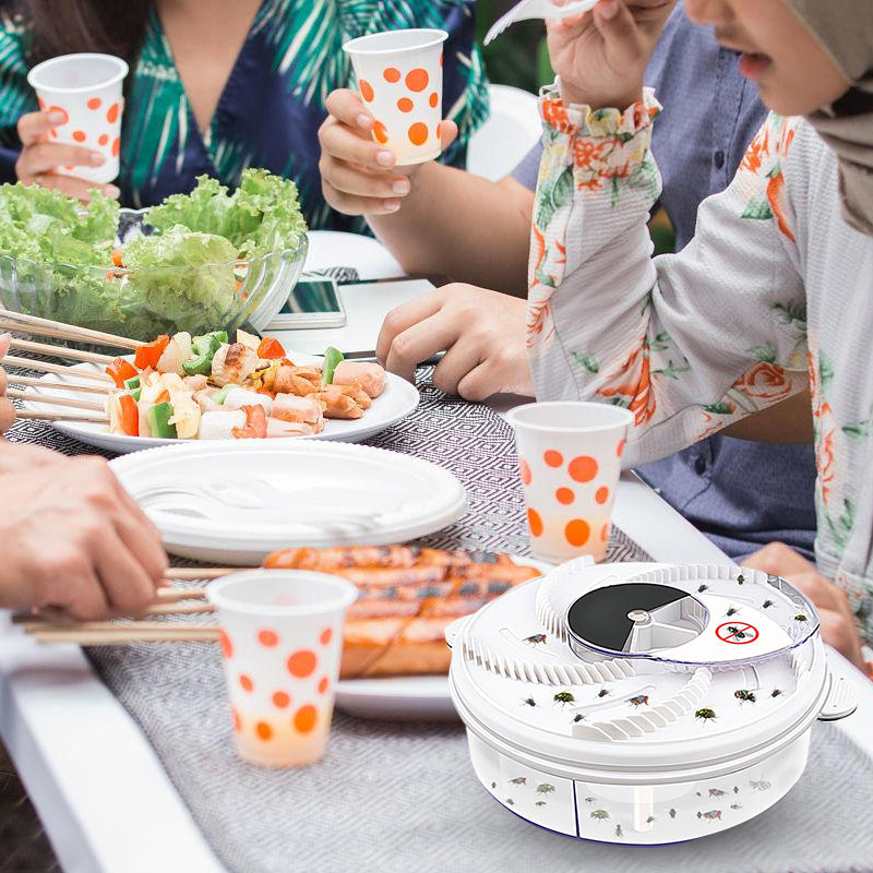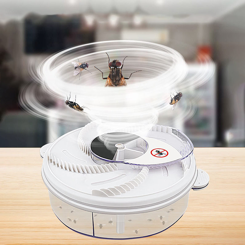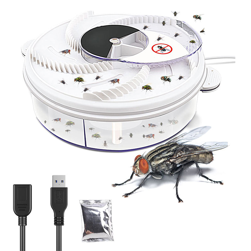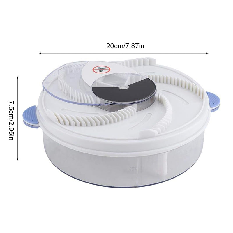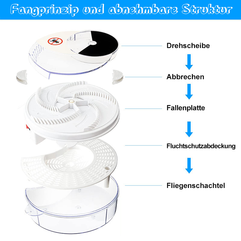 • Fangprinzip: Geben Sie Zuckerwasser oder weiche Futterkrümel in die 5 Köderstationen der elektrischen Fliegenfalle. Wenn die Fliegen voll sind, fegt der rotierende Arm sie weg, fängt sie darin ein, sie fliegen in die Auffangbox und sterben nach ein paar Minuten ab Tage ziehen Sie am Boden, um das Fach zu leeren.