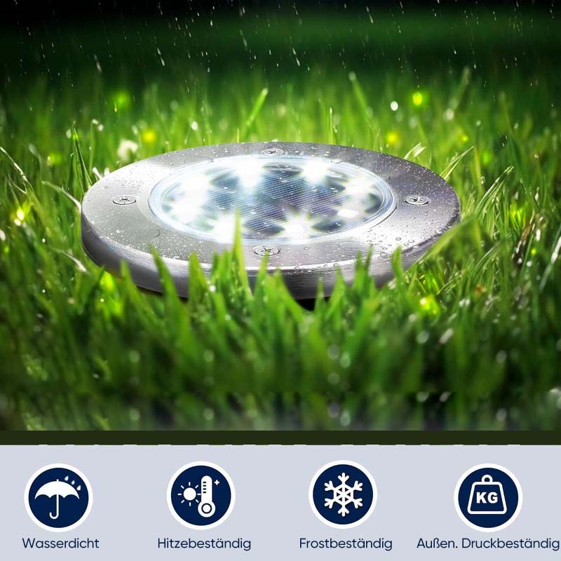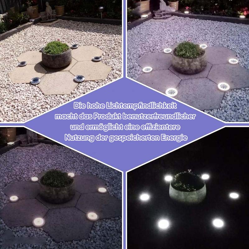 Dieses solarbetriebene automatische Bodenlicht wurde nicht nur für Dekorationszwecke, sondern auch für Rasensicherheits- und Notfallzwecke entwickelt. Sie können diese Produkte bequem verwenden, da für den Betrieb kein Strom benötigt wird. Diese LED-Leuchten können Ihnen helfen, Ihren Rasen und Garten nachts sicher zu halten, da sie ein helles Licht liefern, mit dem Sie nachts sehen können, was sich auf Ihrem Rasen oder Garten befindet.