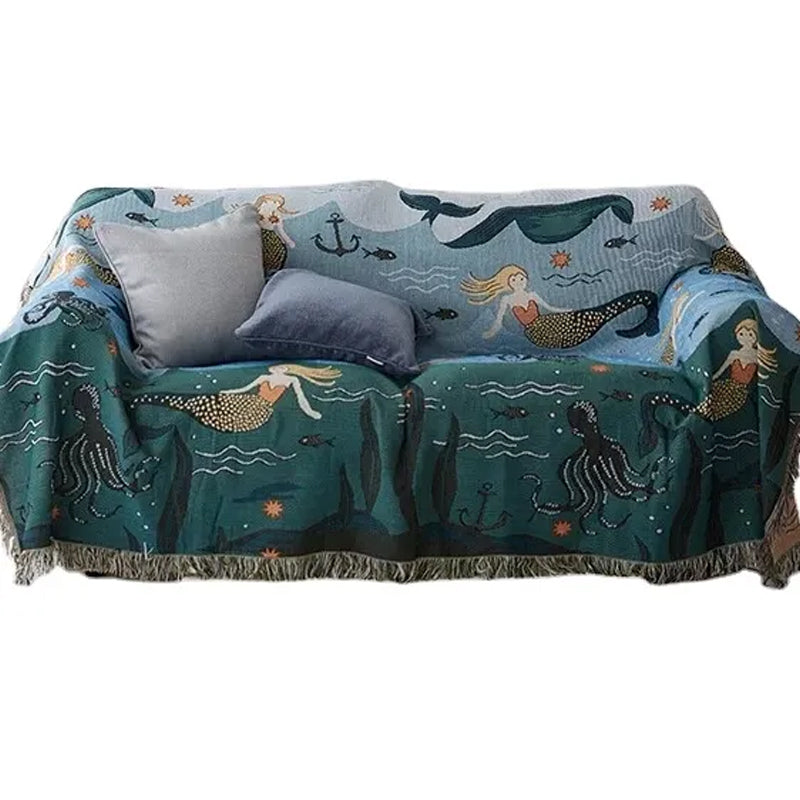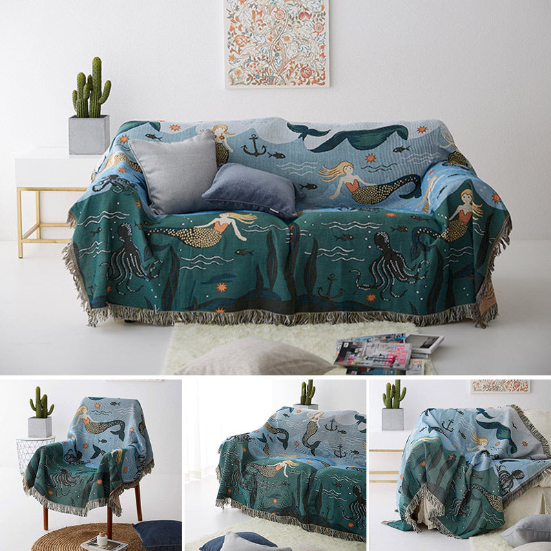 ❦❦【Kreatives Design】 Das Muster ist voll von kreativem Design, lebendigem Meerjungfrauenmuster, verziert mit exquisiten Fransen, romantisch und luxuriös, wodurch die Qualität des Sofabezugs weiter verbessert wird. Dieser Sofabezug kann die Möbel vollständig schützen und die Lebensdauer des Sofas verlängern Sofa. Dieser Sofabezug kann als Bett, Stuhl, Sofaüberwurf oder dekorative Tischdecke verwendet werden. Wirklich hübsch und verleiht Ihrem Dekor zusätzliche Textur.