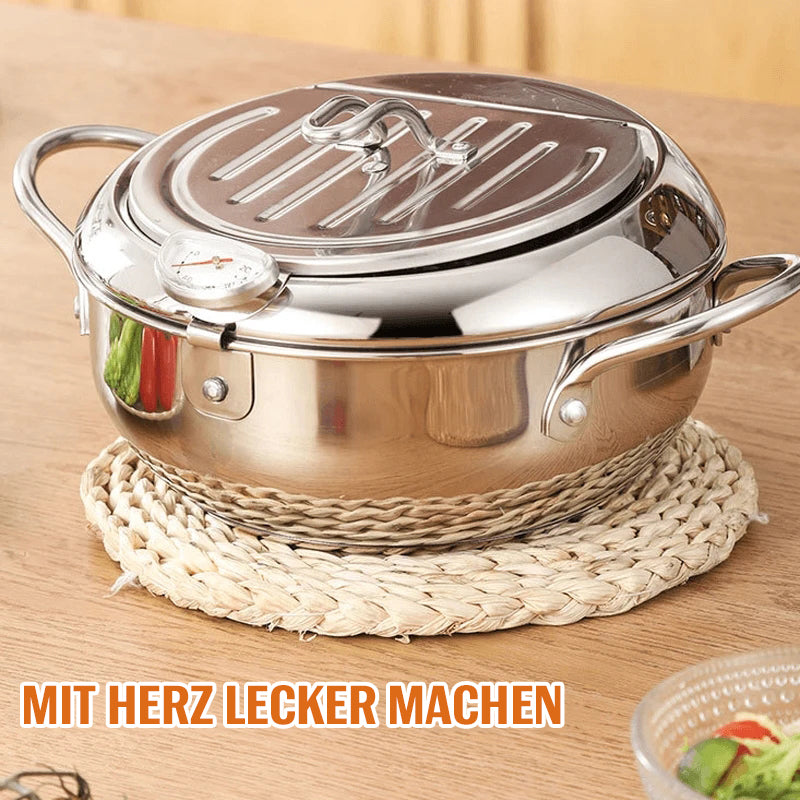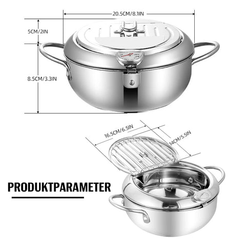 - 🍟 Diese erstaunliche Bratpfanne aus Edelstahl verfügt über einen geräumigen Innenraum, mit dem Sie ganz einfach knusprig gebratene Leckereien zubereiten können!