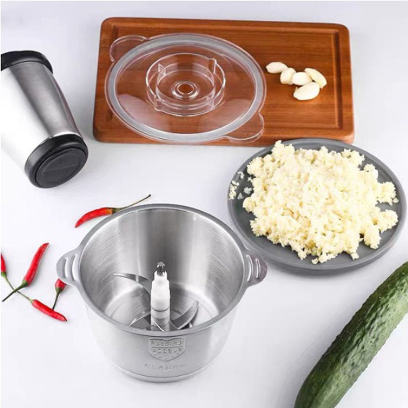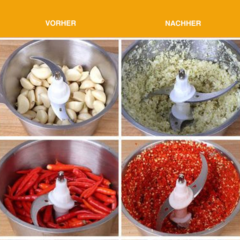 EFFEKTIV UND SCHARF: Mit dem Zerhacker können Sie leicht Gemüse, Obst und Fleisch hacken, Eiswürfel usw. mit 2-teiligen abnehmbaren, scharfen Titanbeschichtungsklingen zerdrücken. Sparen Sie Vorbereitungszeit für Ihre täglichen Mahlzeiten und haben Sie mehr Freizeit.