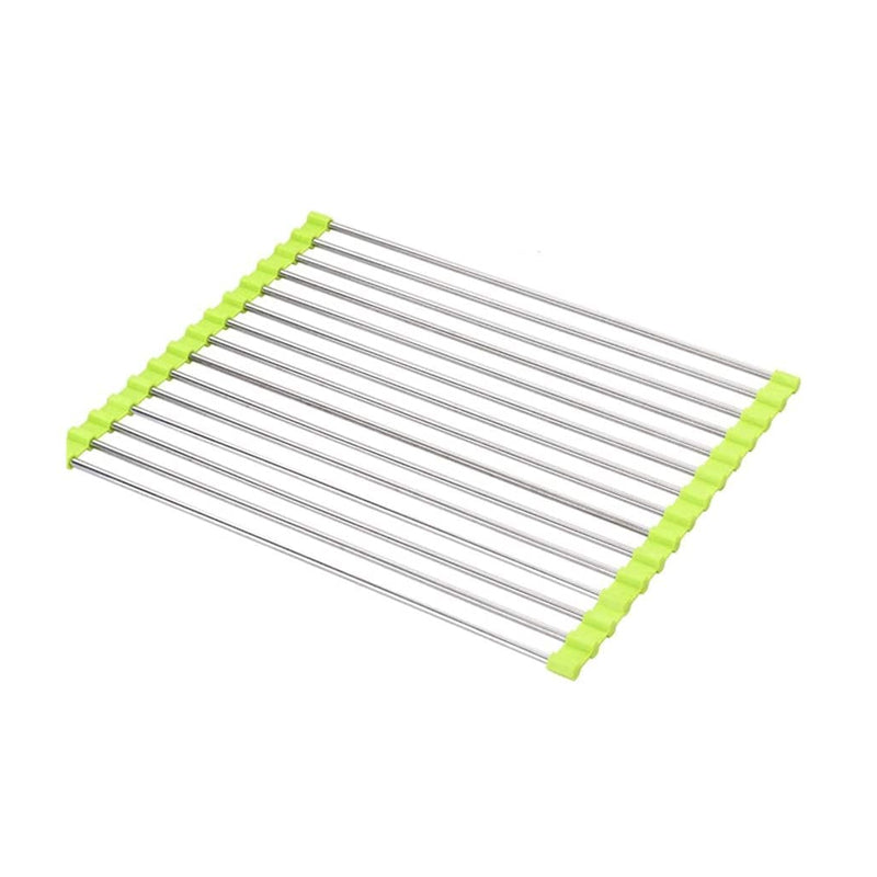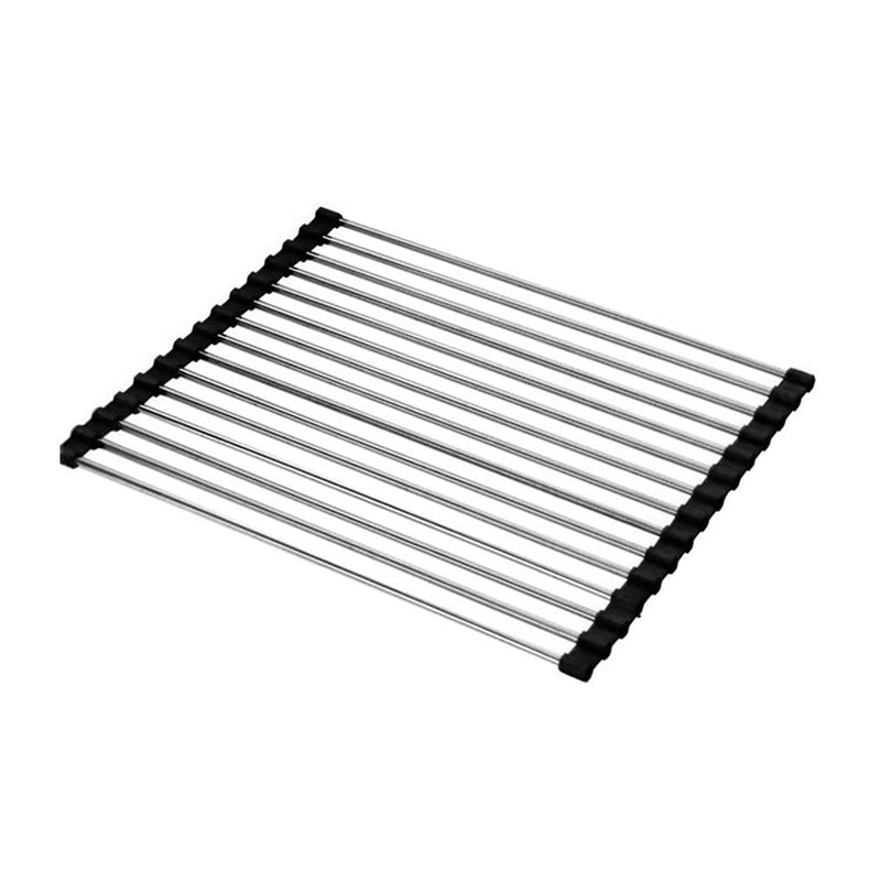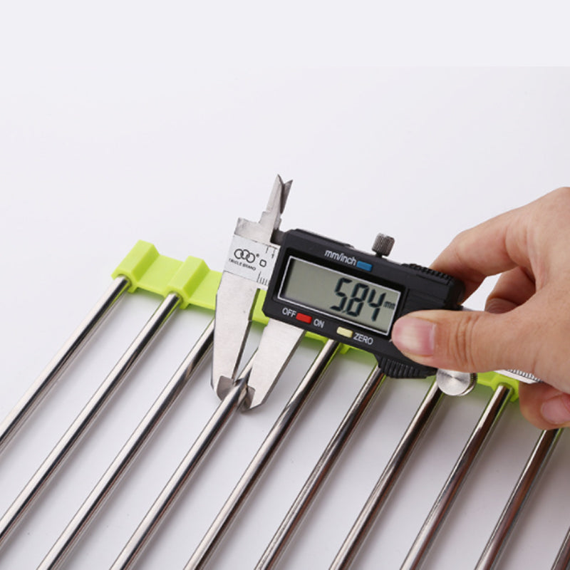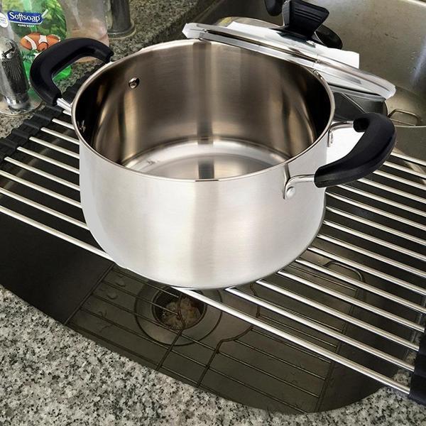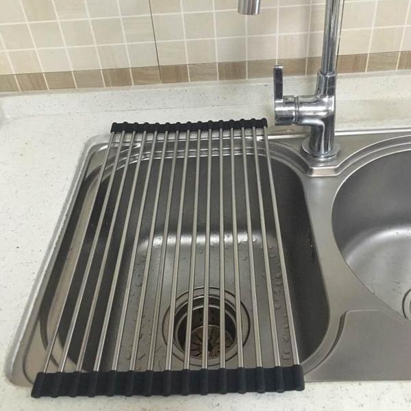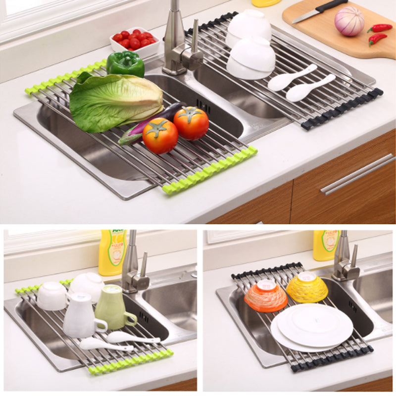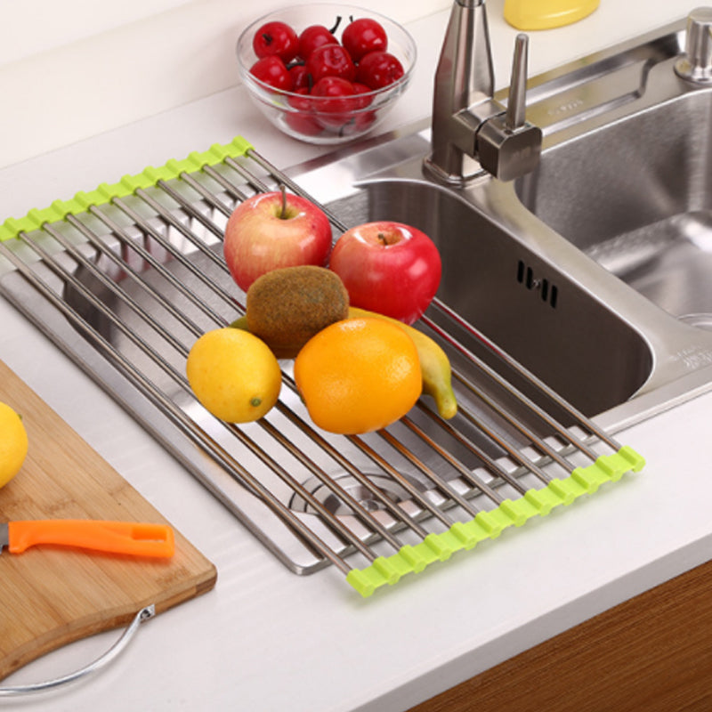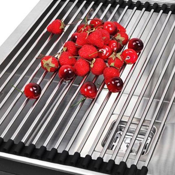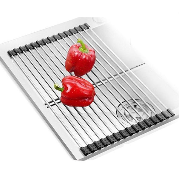 Dieses Faltbare Edelstahl Spüle Trockengestell ist ein platzsparendes Küchen-Muss aus silikonbeschichtetem Stahl, das auch als Wasch- und Auftauschation für Zutaten dient.