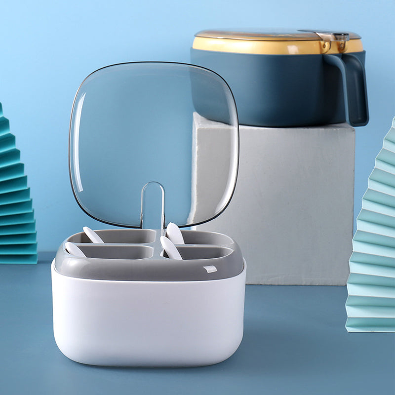 ✿ Vier Fächer einfach zu bedienen: Es enthält eine kleine Innenbox mit vier Fächern, die auch vier kleinen Löffeln für verschiedene Gewürze zugeordnet sind.